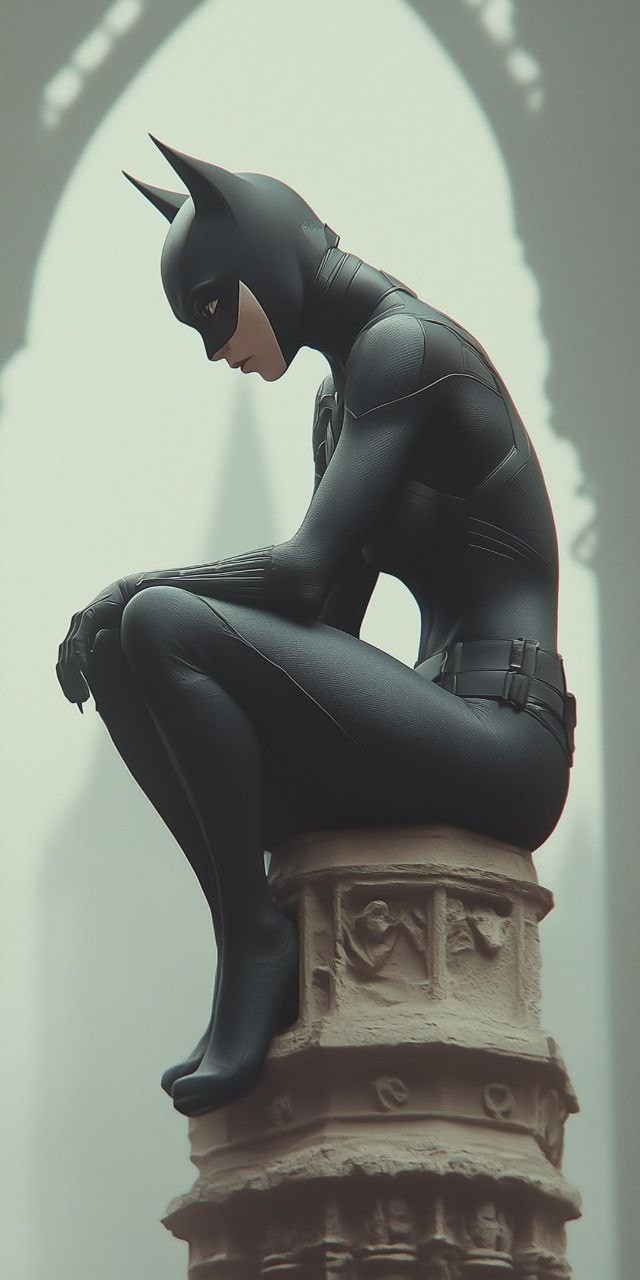 Bring brooding Gotham intensity to your screen with this cinematic 4K wallpaper: sleek Batgirl in ultra detailed black latex suit, cowl with pointed ears, crouched thoughtfully atop an ancient stone gargoyle column in a shadowy Gothic archway, soft moonlight glow highlighting curves and textures, misty atmosphere and dramatic side lighting on deep dark background. Perfect Batgirl fans, DC Comics, female vigilante, dark knight aesthetic, gothic fantasy vibe for phone lock screen or desktop powerful, mysterious & ultra epic feel. High resolution, free to download and enjoy.