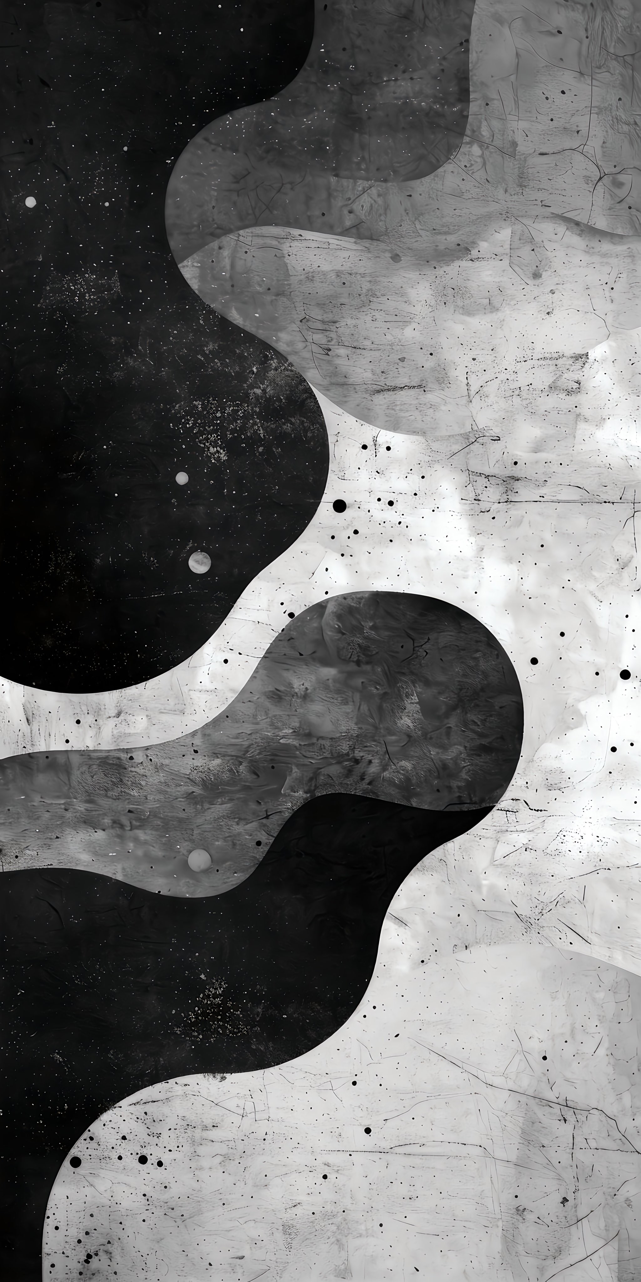 Bring minimalist elegance and cosmic depth to your screen with this stunning 4K wallpaper flowing black ink shapes merging with textured white marble like surfaces, scattered starry specks and subtle gray gradients. Perfect dark, artistic, organic & sophisticated aesthetic for phone lock screen or desktop timeless & premium vibe. High resolution, free to download and enjoy.