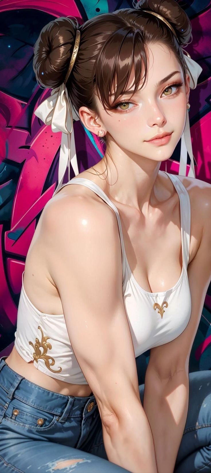 Add stylish anime beauty to your screen with this vibrant 4K wallpaper: a gorgeous girl with brown hair in trendy space buns, golden accessories, and a fitted white crop top with gold details, posing confidently in front of colorful graffiti art. Soft lighting highlights her smooth skin and detailed outfit. Perfect for anime fans, street style lovers, and elegant female character wallpapers ultra high resolution, free download, stunning on AMOLED displays.
