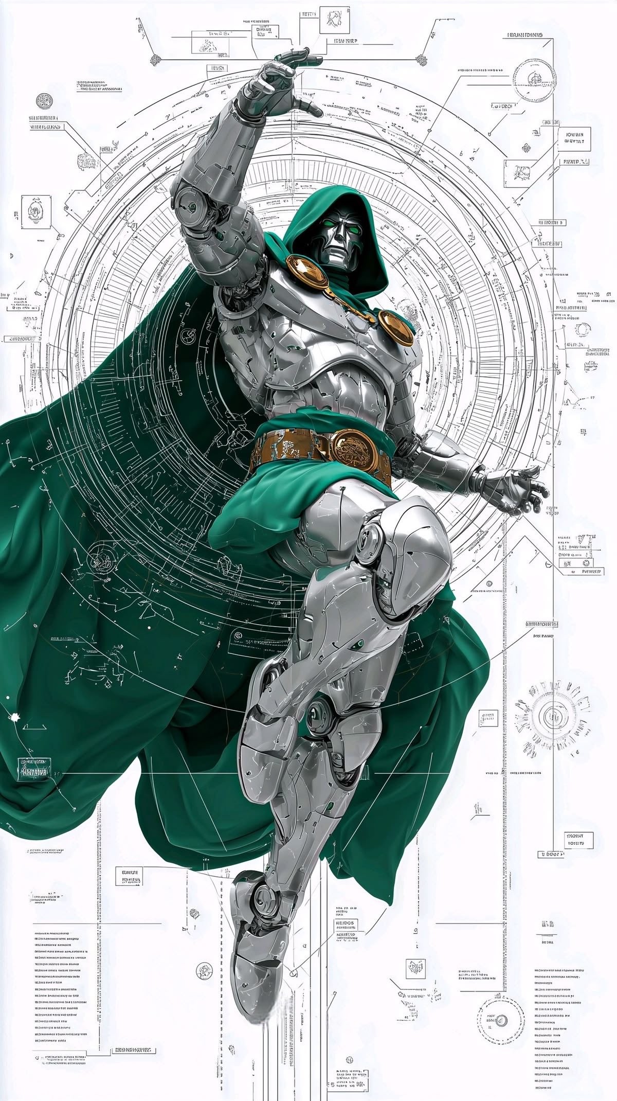 Command ultimate power and dark genius on your screen with this masterful 4K wallpaper: Doctor Doom in commanding pose, cloak billowing, rendered entirely in ultra detailed blueprint wireframe style thousands of precise hand drawn lines, arcane diagrams, Latverian technical annotations, grid overlays, measurements and engineering schematics covering his iconic armored suit, metal mask and mystical energy on aged blueprint background. Perfect Doctor Doom fans, Marvel villain aesthetic, wireframe sorcerer king art, Doom blueprint sketch vibe for phone lock screen or desktop tyrannical, intellectual & ultra detailed energy. High resolution, free to download and enjoy.
