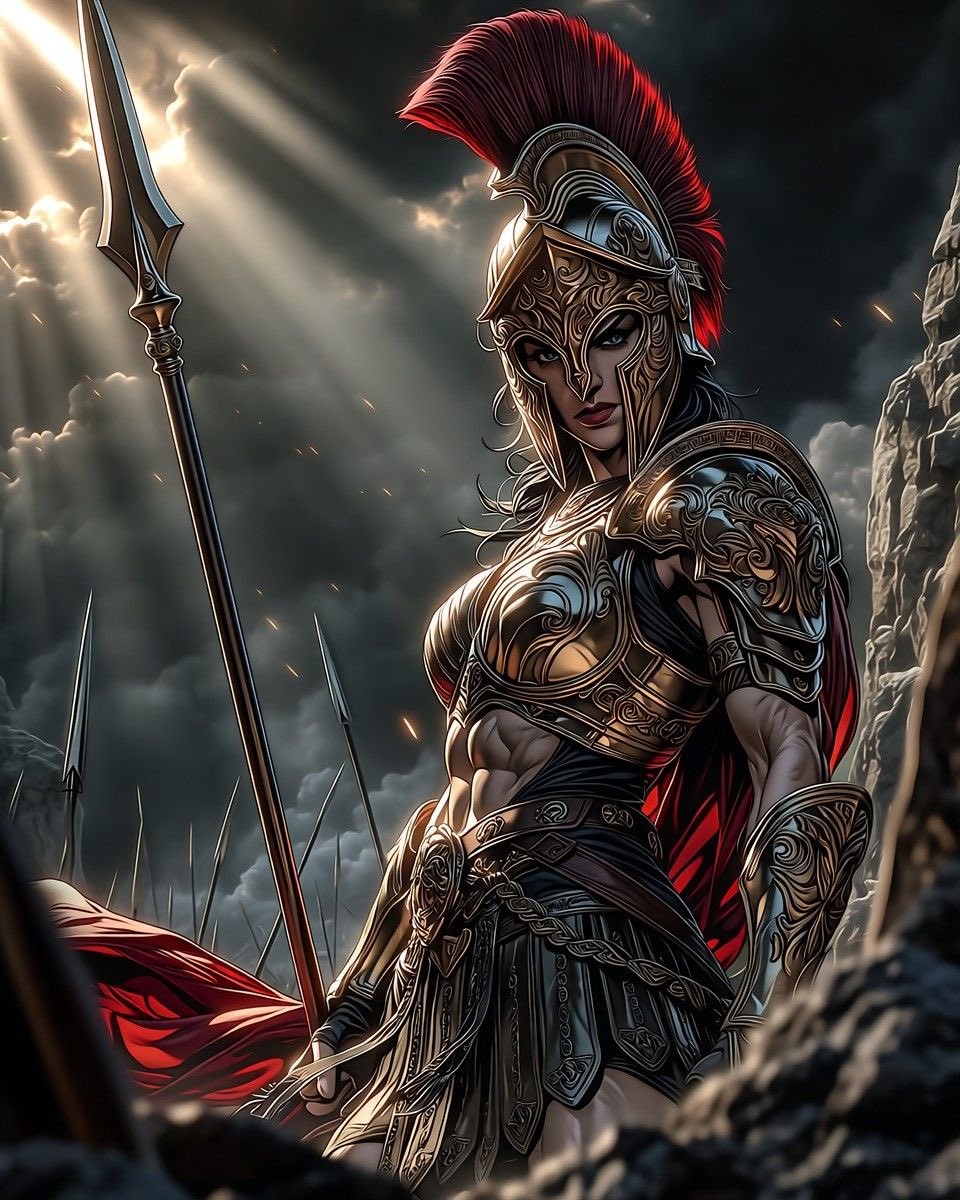 Bring legendary warrior power to your screen with this cinematic 4K wallpaper: a fierce female Spartan warrior in ornate golden armor and red plume helmet, powerfully holding a spear amid dramatic god rays and smoky battlefield. Intense lighting, muscular details, flowing red cape and commanding pose create an epic mythology atmosphere. Perfect for strong female characters, Spartan and warrior fans ultra high resolution, free download, breathtaking on AMOLED displays.