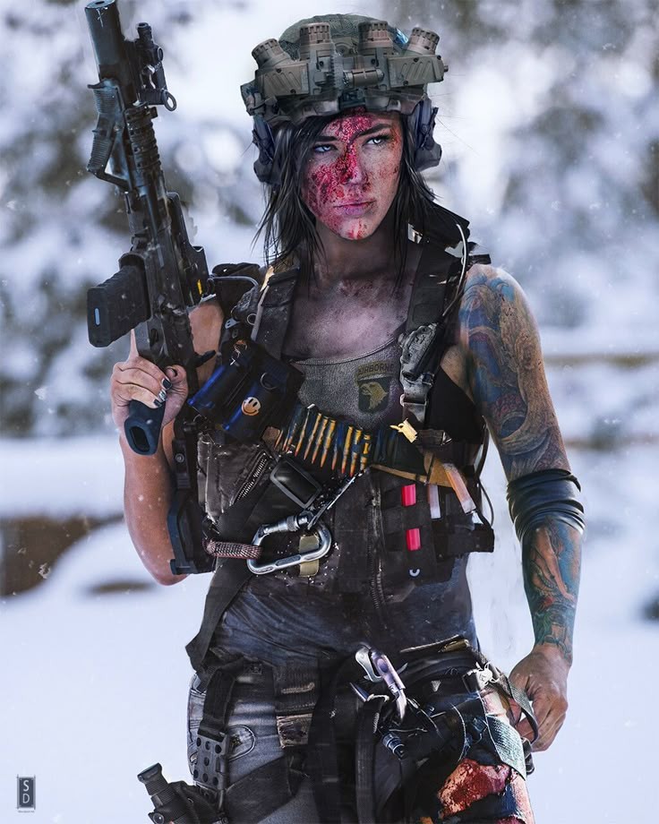 Dominate your screen with raw combat intensity and unbreakable resolve in this cinematic 4K wallpaper: fierce female special forces operator in full tactical loadout multicam camo uniform soaked in mud & blood, heavy plate carrier packed with mags & grenades, helmet with comms & NVG mount, face streaked in dramatic red blood camo war paint, long dark hair whipping in wind, gripping suppressed assault rifle in aggressive ready stance amid heavy snowfall and frozen winter forest. Perfect female operator aesthetic, tactical warrior vibe, blood face snow camo realism, elite spec ops energy for phone lock screen or desktop brutal, cinematic & ultra authentic feel. High resolution, free to download and enjoy.