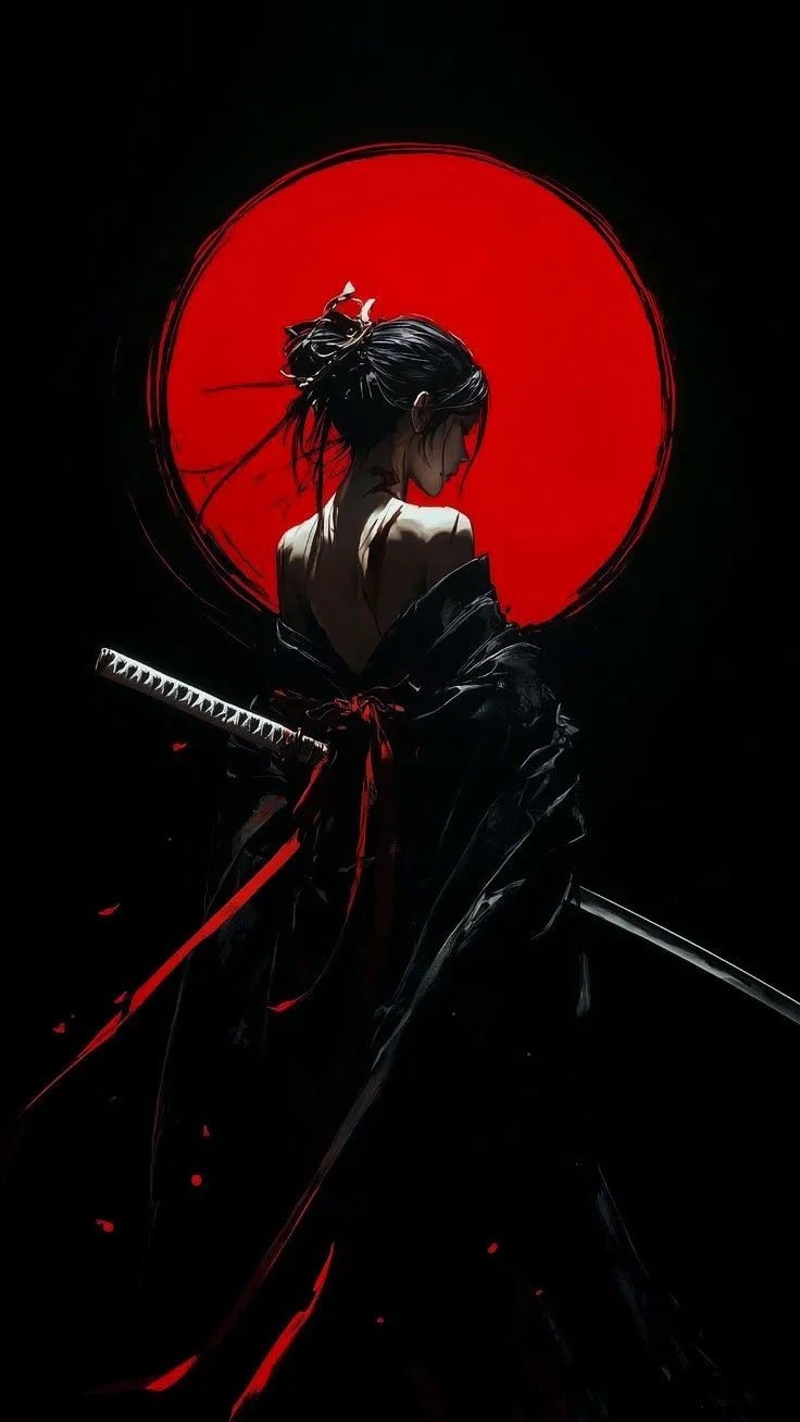 Unleash dark samurai power on your screen with this intense 4K wallpaper: a fierce female warrior in flowing black kimono with red accents, katana drawn, standing before a massive blood red moon on pure black background. Dramatic lighting, red splatter effects and elegant silhouette create cinematic tension and mystery. Perfect for samurai, anime warrior and dark aesthetic fans ultra high resolution, free download, breathtaking on AMOLED displays.