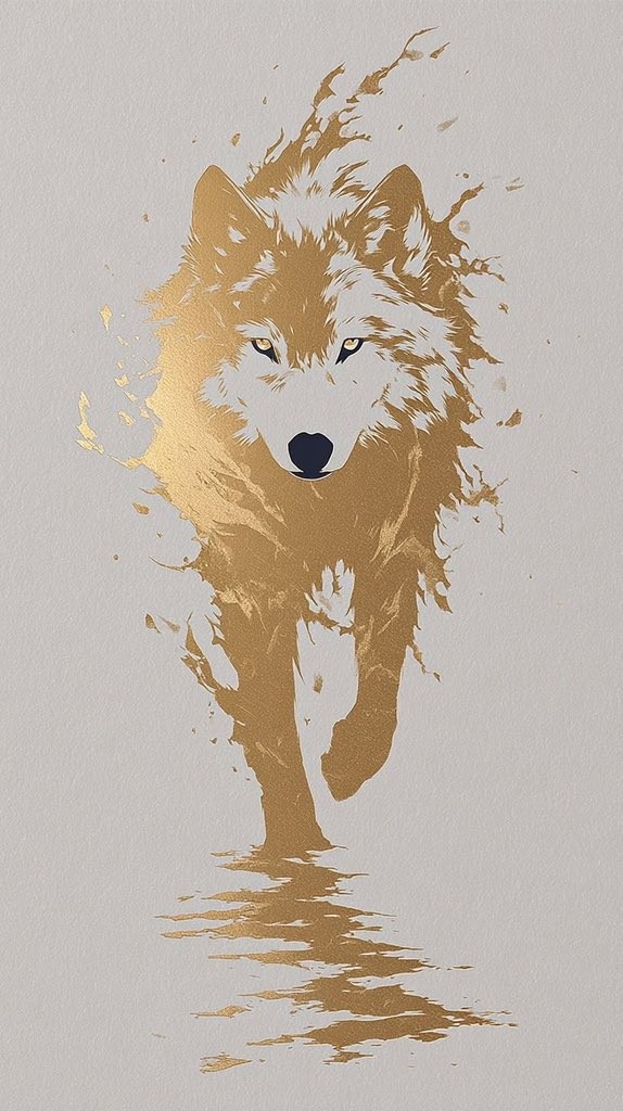 Add powerful elegance to your screen with this stunning 4K abstract wallpaper: a majestic golden wolf emerging from a splash effect with intense yellow eyes and detailed fur, reflected in calm water below. Clean light grey background creates a modern, artistic and minimalist look. Perfect for wolf lovers, animal art fans and premium aesthetic wallpapers ultra high resolution, free download, beautiful on AMOLED displays.