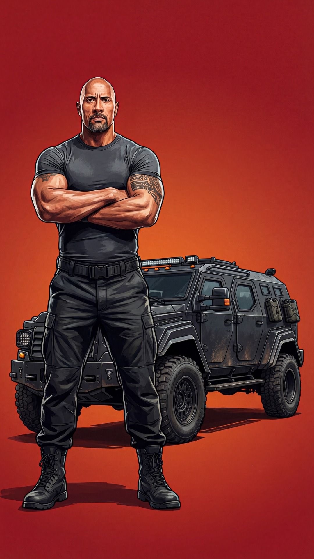 Dominate your screen with unstoppable power and alpha energy in this intense 4K wallpaper: Dwayne "The Rock" Johnson in black tactical gear, massive arms crossed, fierce stare, tribal tattoos visible, standing tall beside a matte black armored Hummer H2 with roof lights, bull bar, off road tires and subtle red underglow accents on fiery red gradient background. Perfect Dwayne Johnson fans, action hero aesthetic, tactical Hummer vibe, red black alpha flex for phone lock screen or desktop brutal, commanding & ultra badass mood. High resolution, free to download and enjoy.