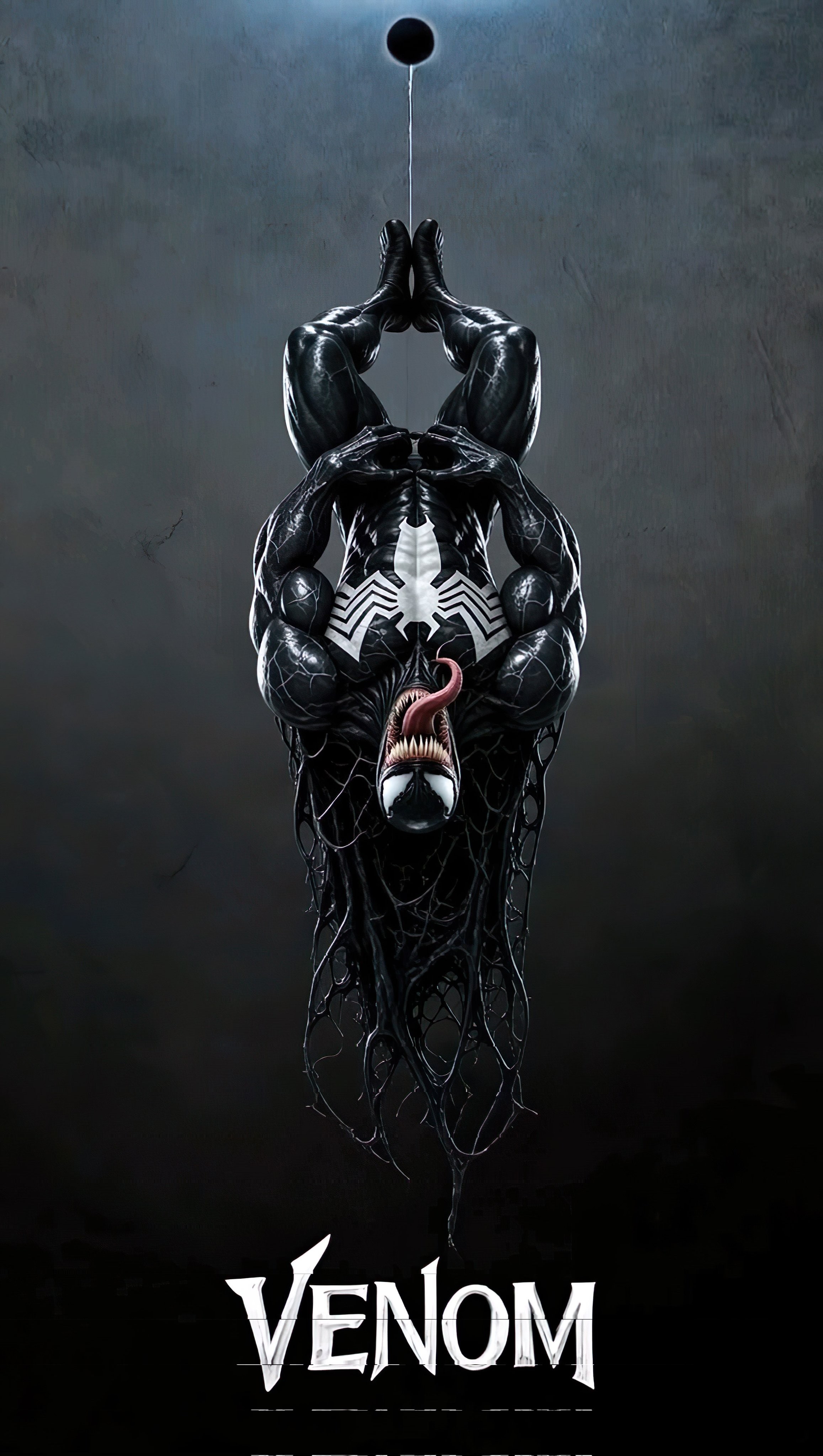 Immerse your screen in pure symbiote terror with this dark 4K Venom wallpaper. Iconic upside down hanging pose with muscular black symbiote body, white spider logo, sharp teeth, long tongue and dramatic top lighting against a moody dark background. Perfect for Marvel Venom fans, symbiote lovers and dark superhero enthusiasts ultra high resolution, free download, intense on AMOLED displays.