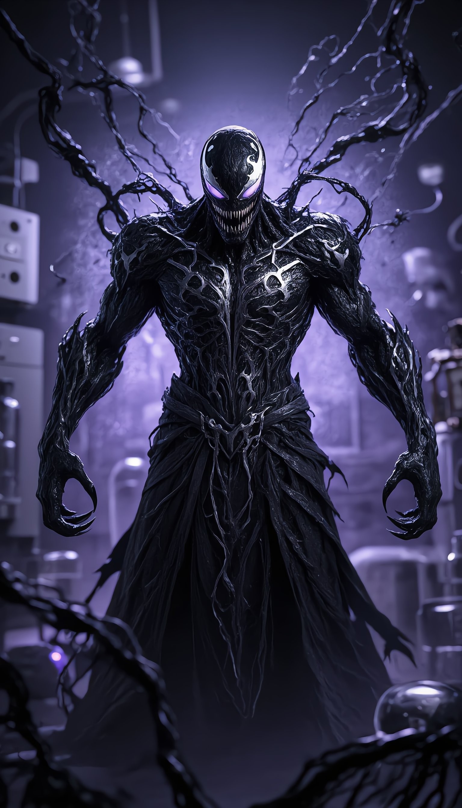 Unleash raw symbiote horror and terrifying power on your screen with this epic 4K wallpaper: menacing Venom standing tall in a dark laboratory, glowing white purple eyes, razor sharp teeth, massive muscular black symbiote body with dripping tendrils and chaotic web like extensions, dramatic purple volumetric lighting and misty atmosphere creating ultimate dread. Perfect Venom fans, symbiote purple glow aesthetic, dark lab horror vibe, Marvel anti hero energy for phone lock screen or desktop terrifying, powerful & ultra intense mood. High resolution, free to download and enjoy.