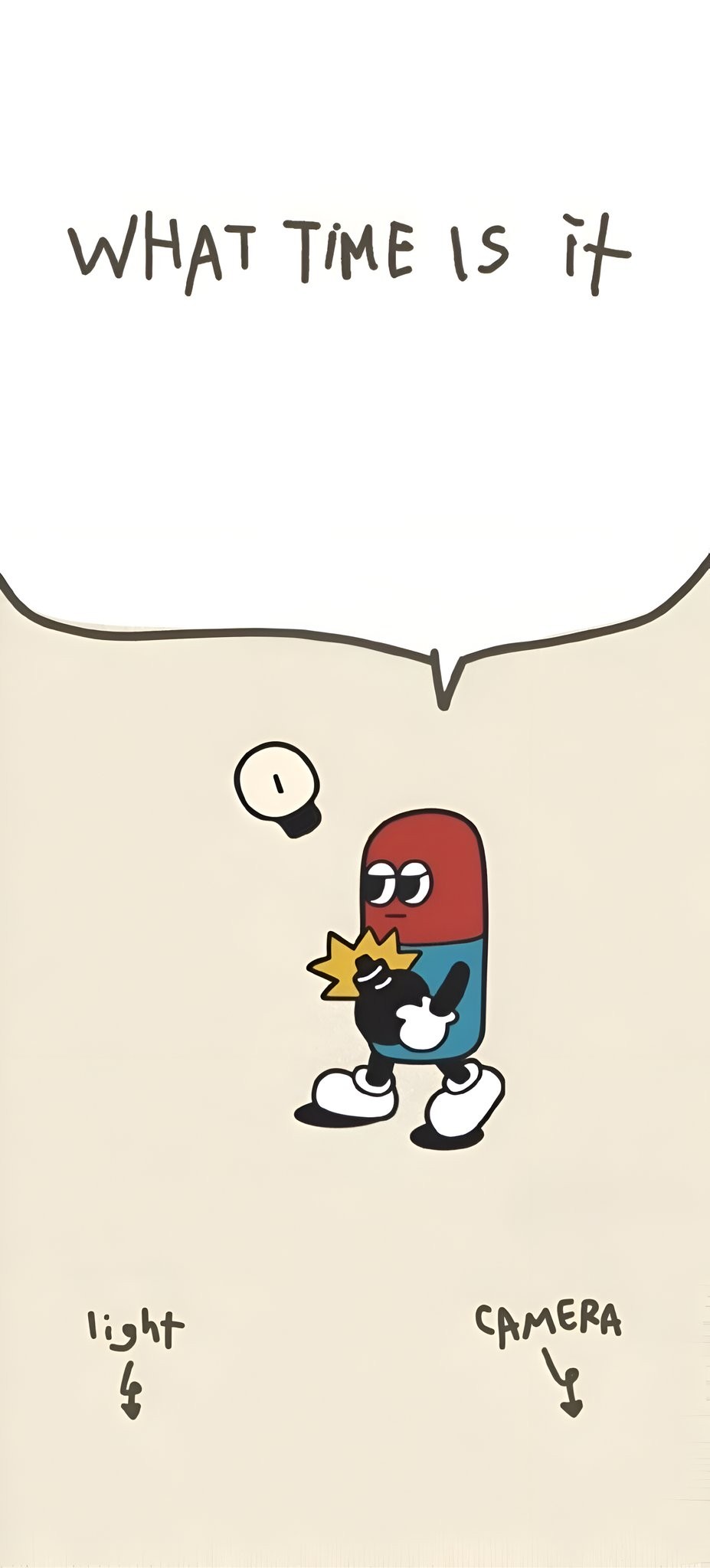 Turn your lock screen into instant chaotic meme energy with this hilarious 4K wallpaper: confused red blue pill character holding a glowing light bulb and camera, big tired eyes, running pose, surrounded by floating stars on pure black space background, bold white text “WHAT TIME IS IT” at top and “light ↑ CAMERA ↓” arrows at bottom. Perfect meme lovers, what time is it pill meme, light camera funny aesthetic, chaotic black void vibe for phone lock screen or desktop absurd, relatable & guaranteed “same” reactions every unlock. High resolution, free to download and enjoy.