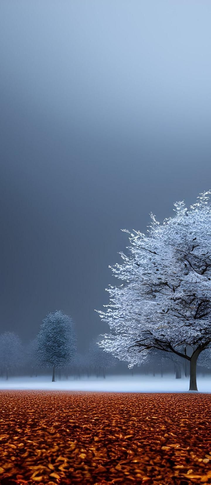 This atmospheric nature photograph captures a stunning and dramatic transition between autumn and winter. The foreground is covered in a rich carpet of vibrant orange fallen leaves, creating a warm contrast with the cold scene above. A large, prominent tree on the right and a misty forest in the background are heavily frosted with snow or ice, appearing brilliantly white against a moody, dark blue-grey winter sky. The scene evokes a sense of quiet beauty and the changing seasons. This visual is ideal for nature lovers, seasonal content, wallpapers, and themes related to dramatic landscapes and color contrasts.