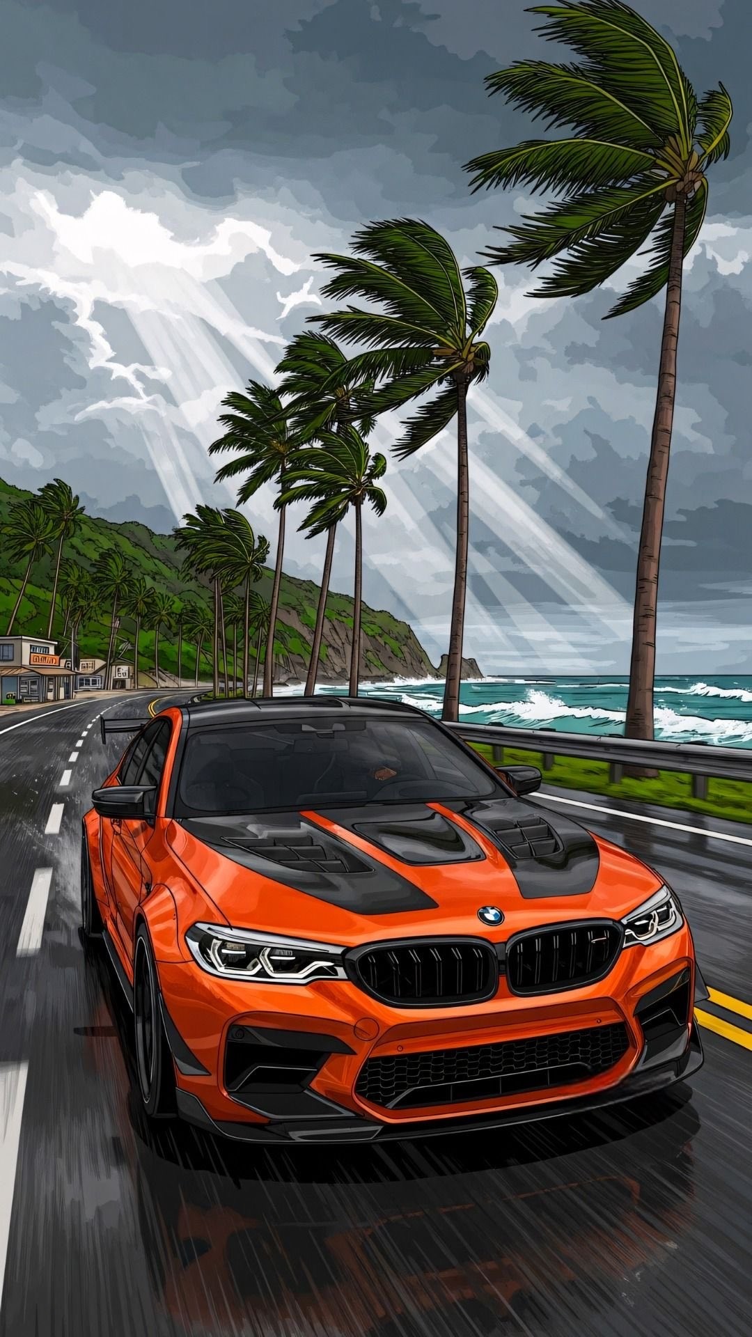 This vibrant and dynamic illustration features an aggressive orange BMW M5 sports sedan with black accents, driving along a picturesque and slightly stormy coastal road. The road is wet, reflecting the dramatic, cloud-filled sky where rays of sunlight break through. The scene is lined with tall, swaying palm trees, and in the background, a beautiful ocean with crashing waves against lush green cliffs completes the tropical yet intense scenery. The art style is bold and detailed, with a slightly illustrative or anime-like quality that emphasizes movement and atmosphere. This visual is perfect f