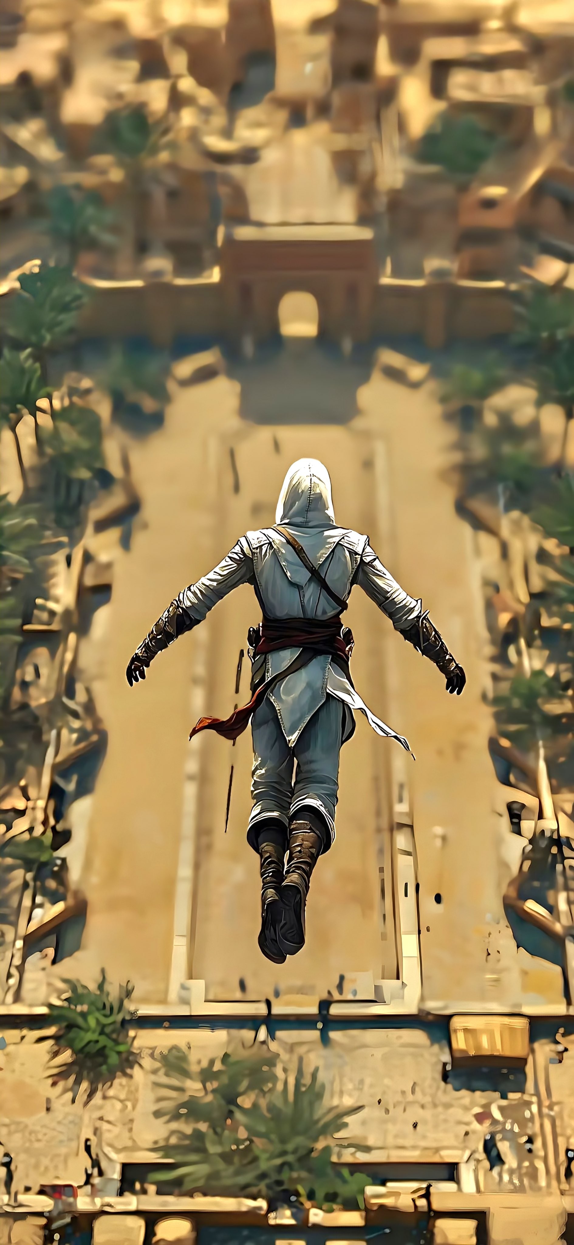Capturing the essence of the Assassin's Creed series, this epic image shows a hooded protagonist mid-air, executing the signature Leap of Faith. The white-clad assassin plunges from the heights of a desert fortress towards the safety of a hay bale landing below. This iconic action shot highlights the thrill of parkour and free running through a stunning historical setting. Perfect for gaming fans, video game art collectors, and anyone seeking a dynamic gaming wallpaper that symbolizes bravery and commitment.