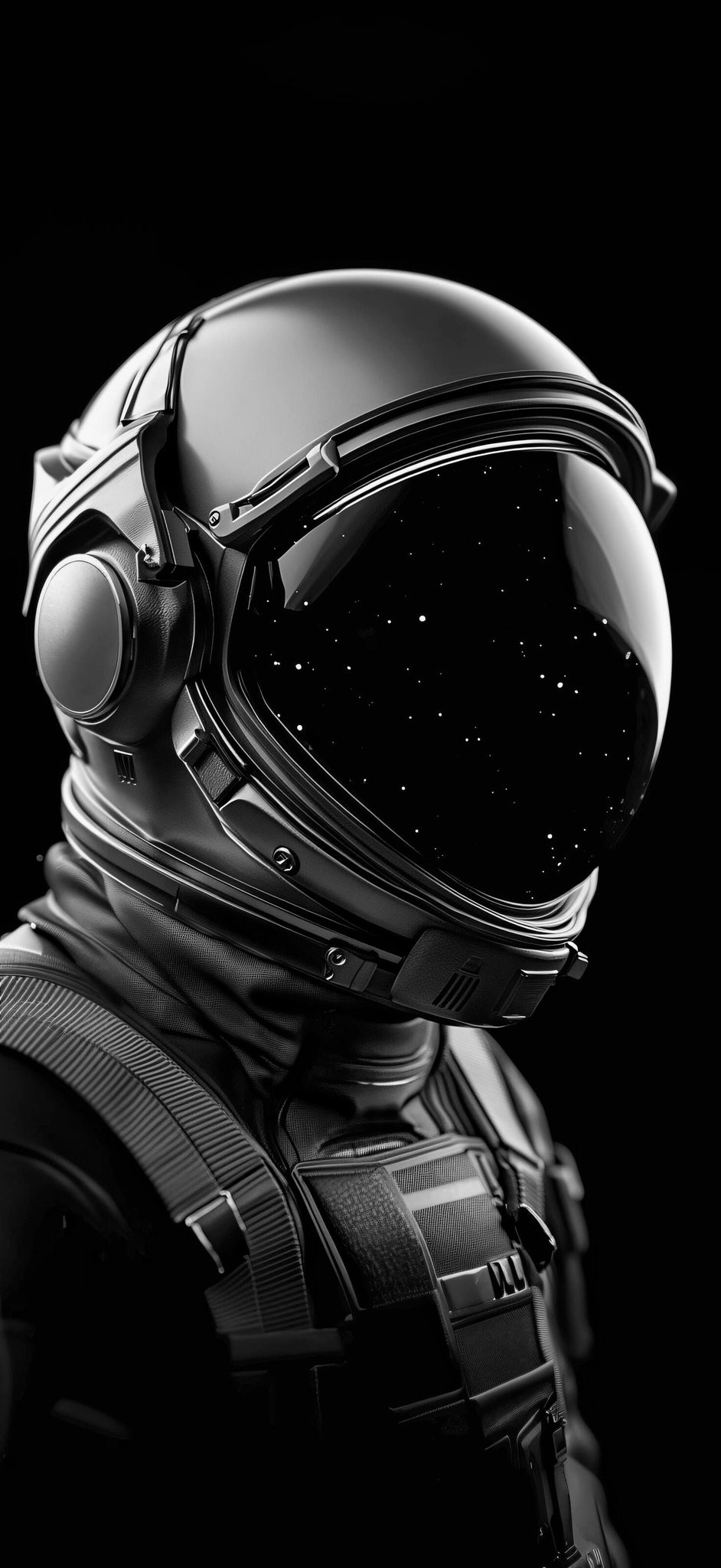 Bring deep space mystery and futuristic isolation to your screen with this ultra detailed 4K wallpaper: sleek matte black astronaut helmet in close up, reflective visor showing endless starry cosmos, glowing orange accents on visor rim, textured suit fabric, subtle metallic highlights and dramatic side lighting against pure black void. Perfect sci fi, cyberpunk, space exploration, dark minimal & premium aesthetic for phone lock screen or desktop intense, cinematic & ultra immersive vibe. High resolution, free to download and enjoy.