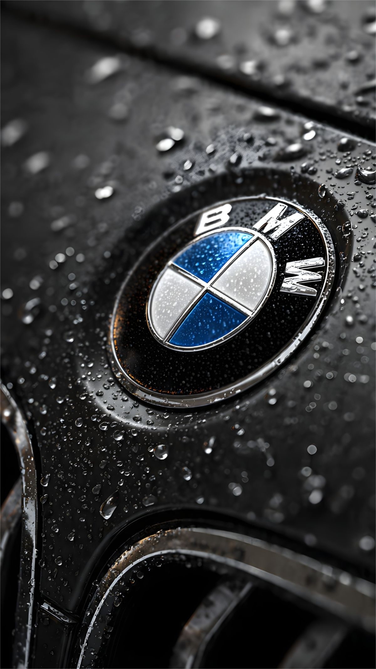 An elegant and detailed vertical close-up photograph of the iconic BMW emblem set against the wet, glossy black paint of a car's hood. Clear raindrops cover the surface and the roundel, highlighting the metallic texture and the blue and white quadrants of the logo. The image focuses on the luxury and quality details, with the edge of the signature kidney grille visible. Ideal for content about German engineering, automotive luxury, BMW branding, car detailing, or high-quality vehicle imagery. Keywords: BMW logo, raindrops, wet car, black luxury car, German engineering, automotive detail, close-up emblem, BMW kidney grille.