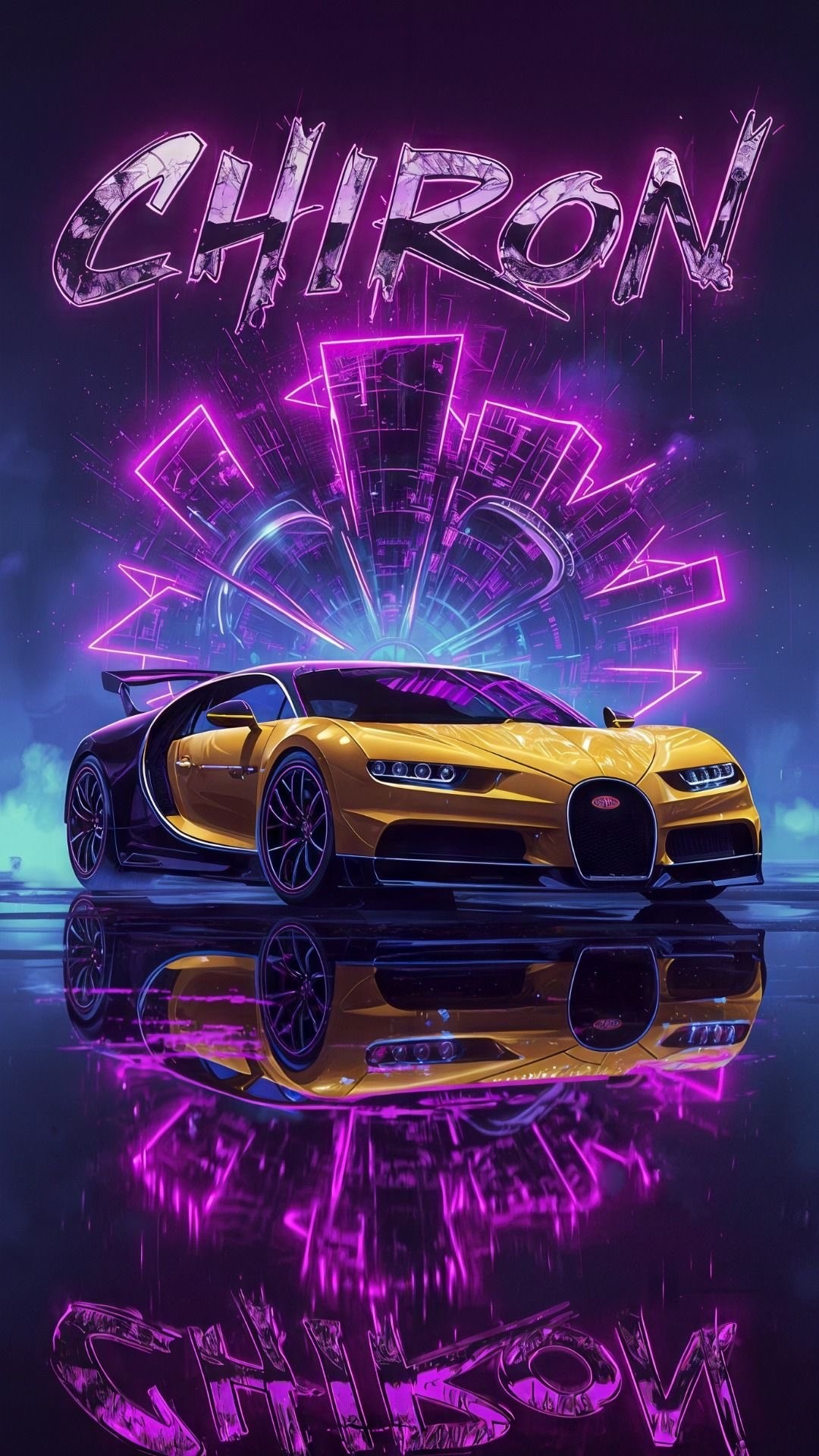 This electrifying digital illustration features the iconic Bugatti Chiron hypercar in a striking two-tone yellow and black, dramatically posed on a reflective wet surface. Above the car, the word "CHIRON" is rendered in a stylized, metallic text, radiating with an intense purple and pink neon glow. The background is a vibrant synthwave-inspired cityscape with abstract glowing lines, evoking a futuristic or retro-futuristic atmosphere. The entire scene is bathed in a brilliant neon light, which reflects beautifully on the wet ground, doubling the visual impact of the car and the