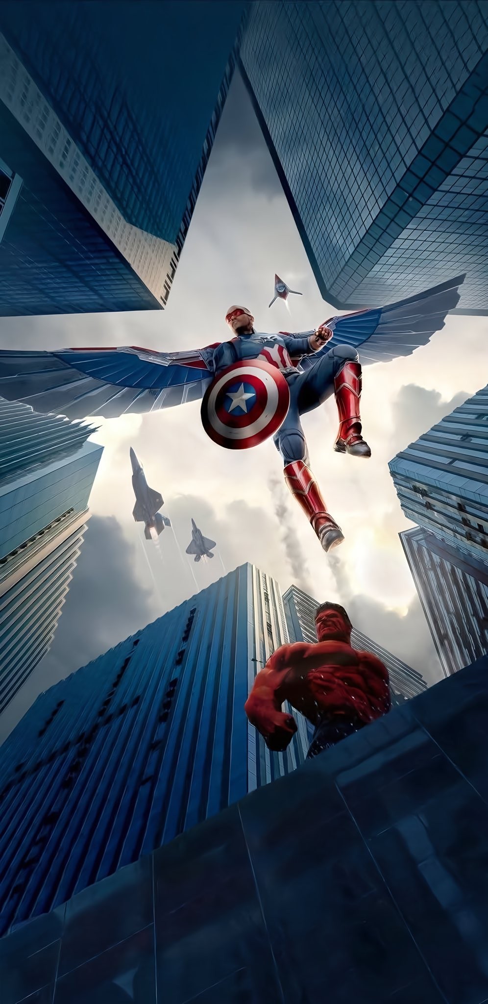 Epic 4K Marvel wallpaper of Sam Wilson Captain America flying with shield while Red Hulk climbs skyscraper. Perfect MCU, Avengers fan art for iPhone & desktop. High resolution, royalty free download.