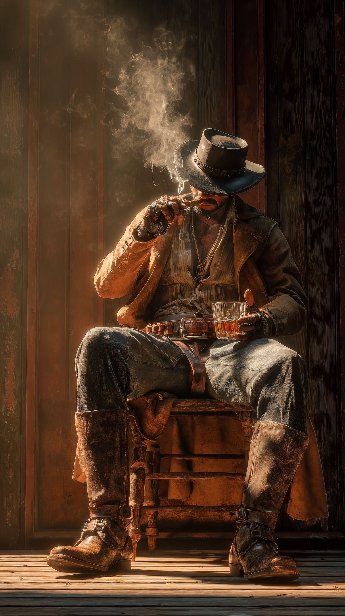 This evocative image portrays a rugged Western outlaw or cowboy, seated and exuding an air of contemplative defiance. Dressed in classic Western attire, including a wide-brimmed hat, long coat, and boots, the figure holds a lit cigar, from which a plume of smoke rises, and a glass of whiskey. The warm, earthy tones and dramatic lighting suggest a rustic setting, possibly a saloon or a wooden cabin, emphasizing the character's mysterious and tough persona. This visual is perfect for content related to the Western genre, cowboy culture, historical fiction, character studies, whiskey bran