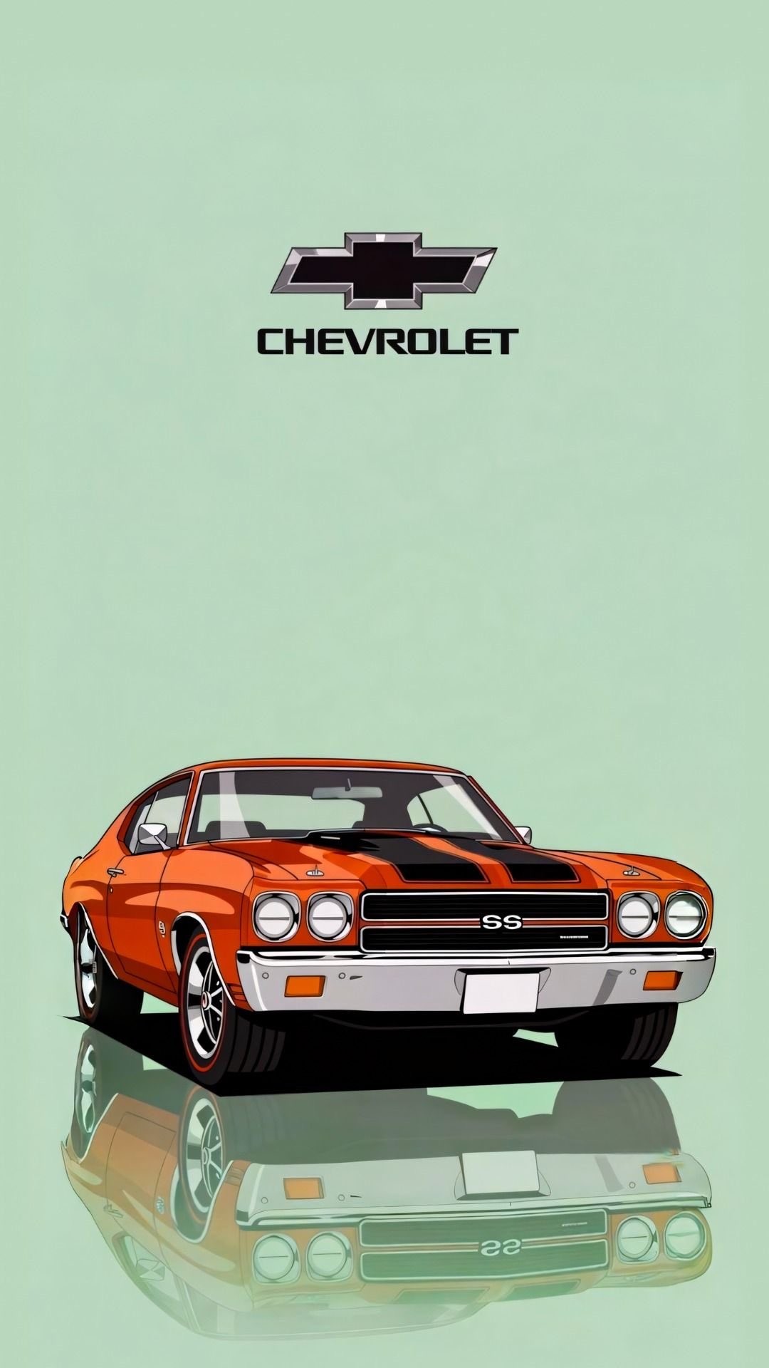 This vibrant and nostalgic illustration features a legendary classic Chevrolet Chevelle SS in a striking orange finish with black racing stripes. The car is depicted in a stylized front-quarter view, showcasing its iconic quad headlights, aggressive grille, and powerful stance. It sits on a reflective surface, creating a subtle mirror image beneath. Above the car, the bold "CHEVROLET" text and bowtie logo are prominently displayed against a clean, solid light mint green background. This visual is perfect for classic car enthusiasts, Chevrolet fans, muscle car art collectors, and content focused on vintage American automobiles, 1970s car culture, and iconic performance vehicles. Ideal for wallpapers, retro automotive marketing, or social media posts celebrating American muscle.