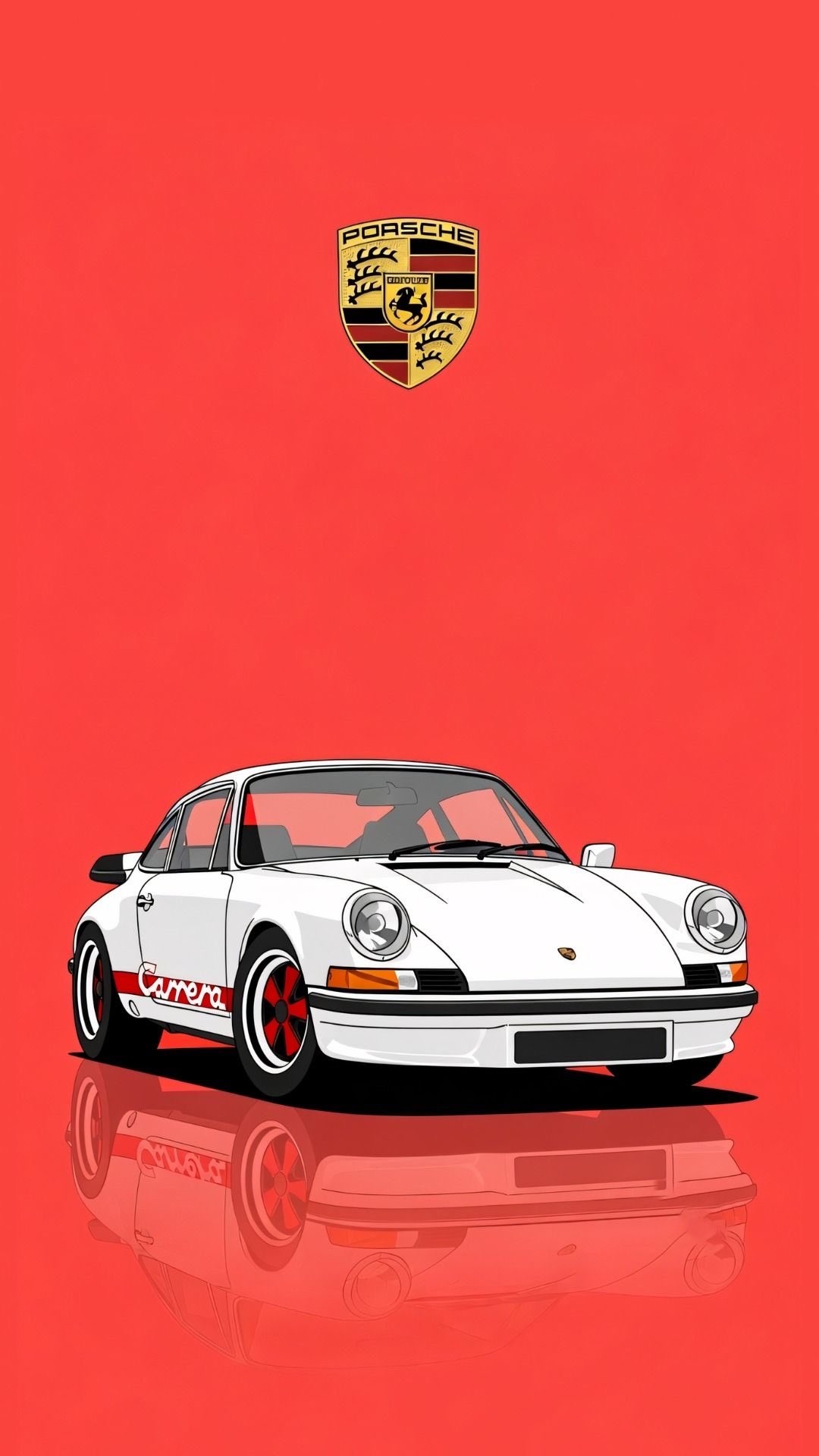 This crisp and nostalgic illustration features a legendary classic white Porsche 911 Carrera sports car, adorned with subtle red accents and "Carrera" script on its side. The car is depicted in a stylized front-quarter view, showcasing its iconic round headlights, sleek lines, and classic Fuchs-style wheels with red centers. It sits on a highly reflective surface, creating a perfect mirror image beneath. Above the car, the distinguished Porsche crest logo is prominently displayed against a clean, solid vibrant red background. This visual is perfect for Porsche enthusiasts, classic car fans, automotive art collectors, and content focused on vintage German engineering, iconic sports cars, and the rich heritage of Porsche. Ideal for wallpapers, retro automotive marketing, or social media posts celebrating timeless design.