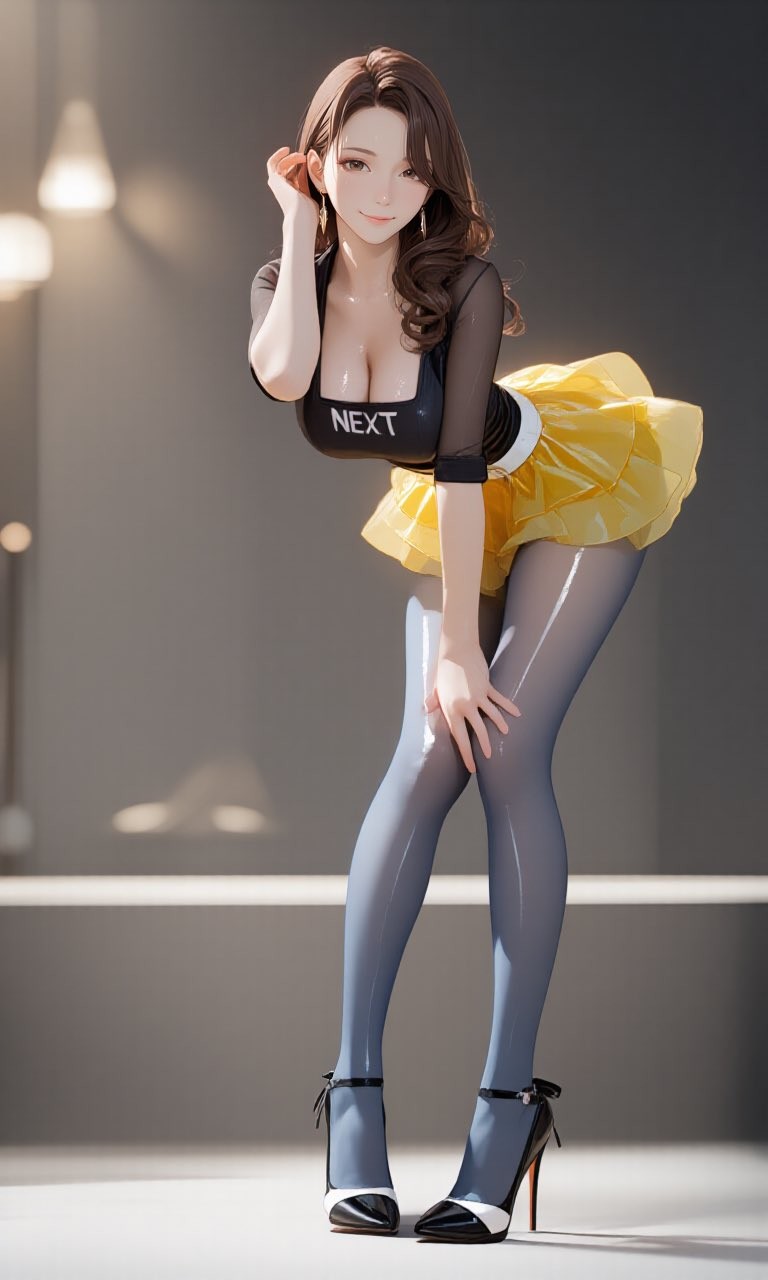 Check out this adorable anime girl striking a playful pose in a "NEXT" crop top, sheer sleeves, vibrant yellow mini skirt, and glossy stockings. Perfect for anime fans and digital art collectors, this high-resolution illustration captures charm and style. Discover more stunning anime artwork now!