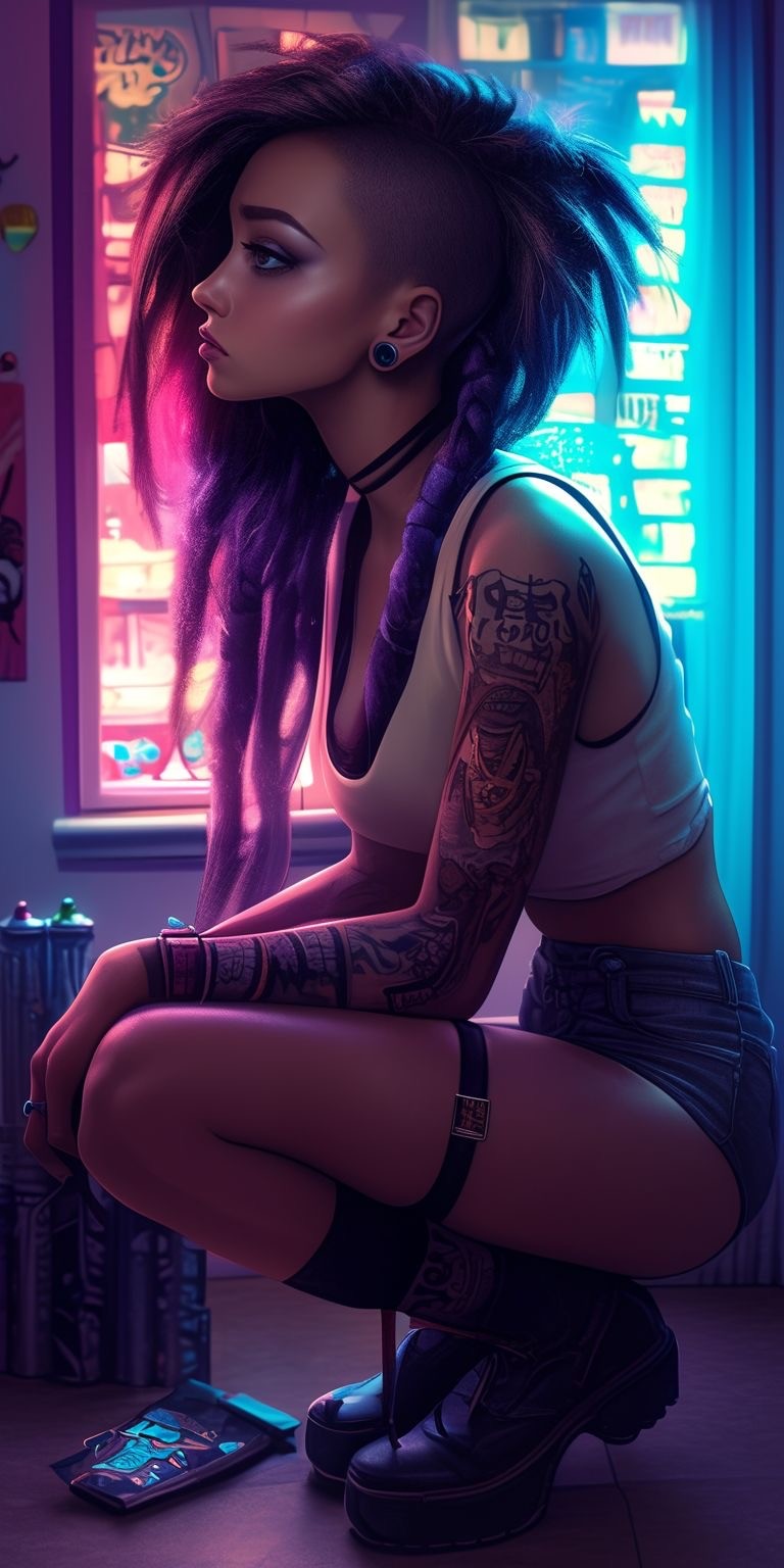 This dynamic digital illustration features a stylish cyberpunk-inspired female character with striking features. She has a partially shaved head with voluminous purple hair styled into braids and a high top, creating a vibrant silhouette. Her arms are heavily adorned with intricate tattoos, and she's dressed in a white tank top, denim shorts, and platform shoes, with a garter strap on her thigh. She's captured in a squatting pose, illuminated by the intense pink and blue neon lights from a window in the background, which creates dramatic shadows and highlights. This visual is p