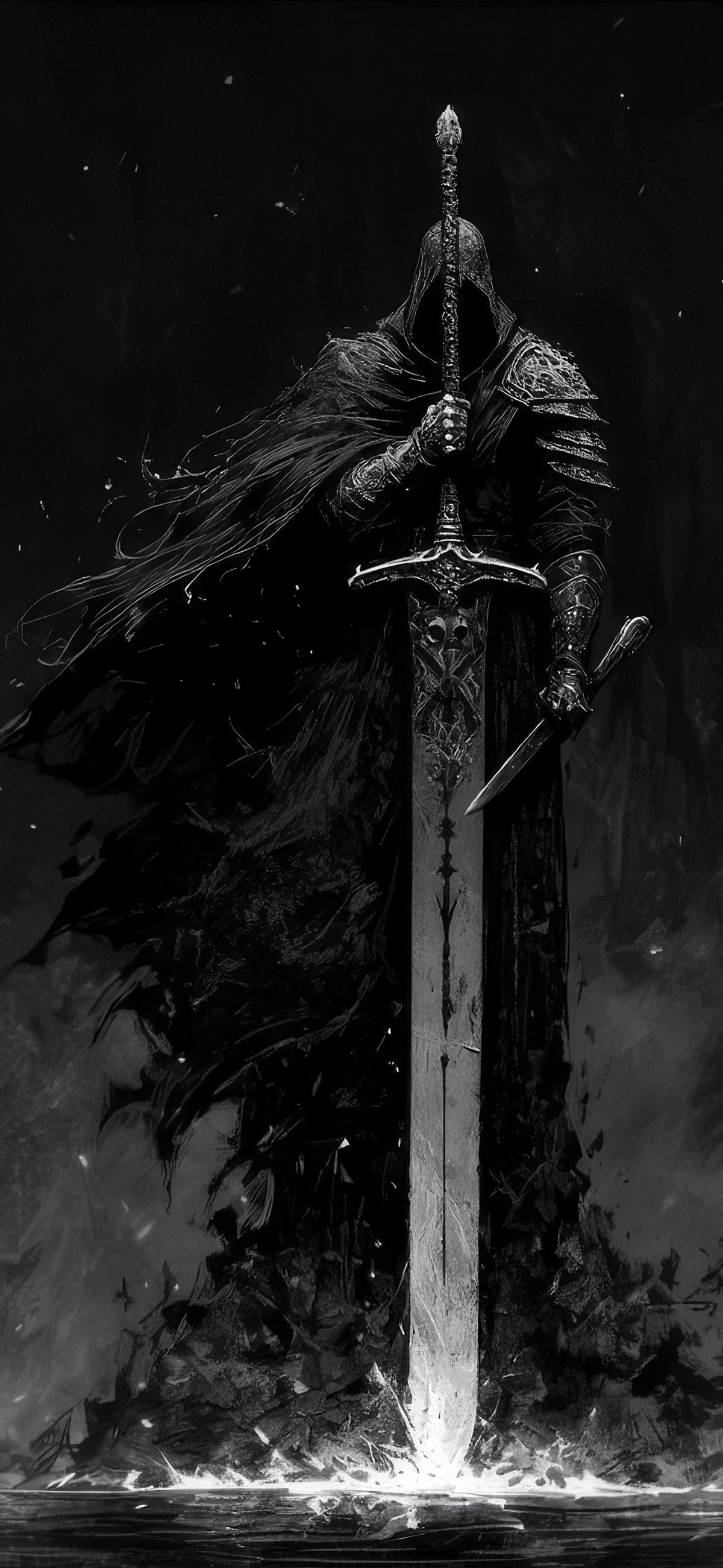 An epic piece of dark fantasy art featuring a hooded warrior or Death Knight cloaked in shadow. The figure stands holding a massive, intricately detailed greatsword that glows with a faint, chilling light. This dramatic, monochromatic image is perfect for fans of Gothic art, dark fantasy RPGs, and those looking for a powerful black and white wallpaper. Represents themes of impending doom, ultimate power, and silent sentinel duty. Use this artwork to capture an atmosphere of mystery and raw medieval power.