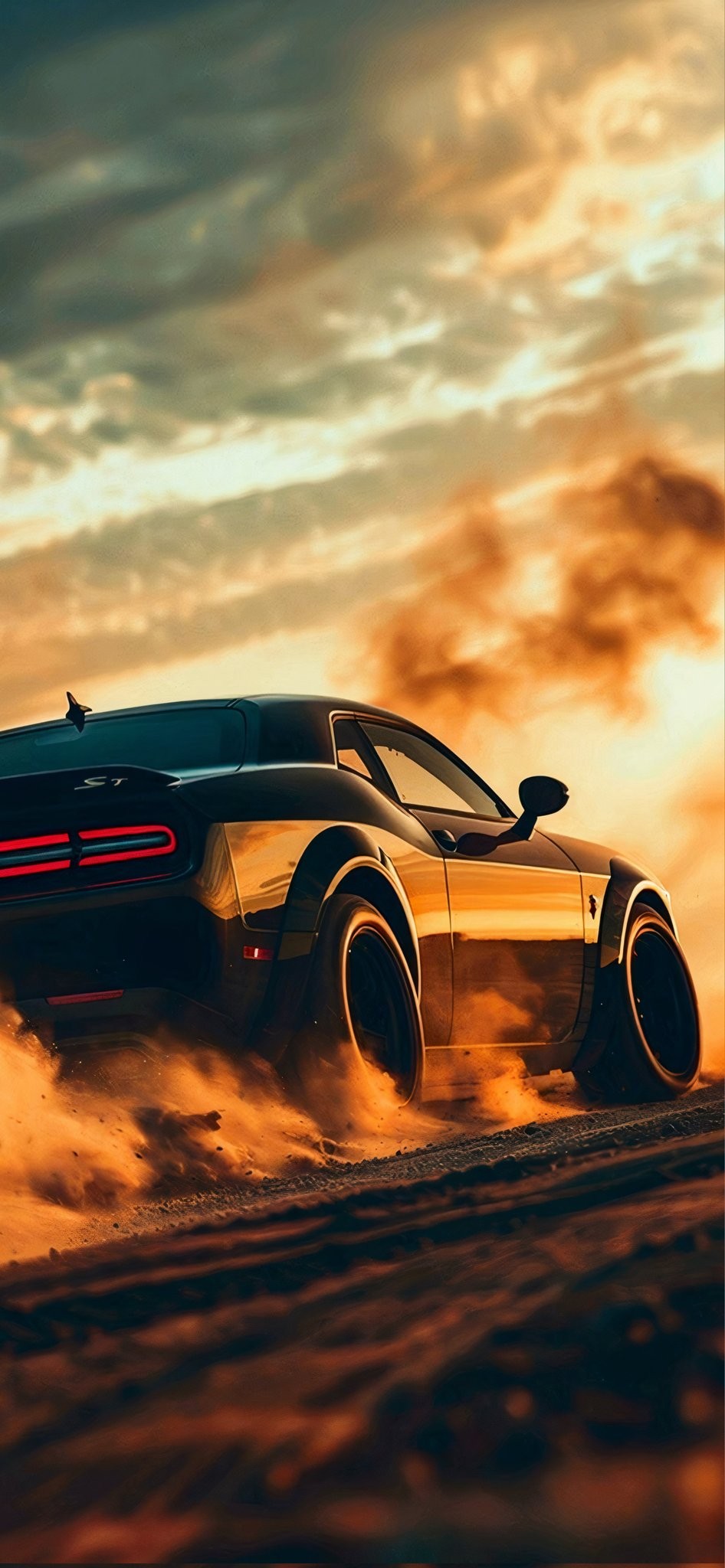 Feel the raw adrenaline rush on your screen with this epic 4K wallpaper: brutal black Dodge Challenger SRT Hellcat / Demon drifting hard at sunset, massive dust cloud exploding behind, glowing red taillights cutting through golden hour light, aggressive widebody kit, low stance and tire smoke trails against dramatic orange purple sky. Perfect muscle car, drift, automotive, sunset & high octane aesthetic for phone lock screen or desktop pure power, speed & cinematic vibe. High resolution, free to download and enjoy.