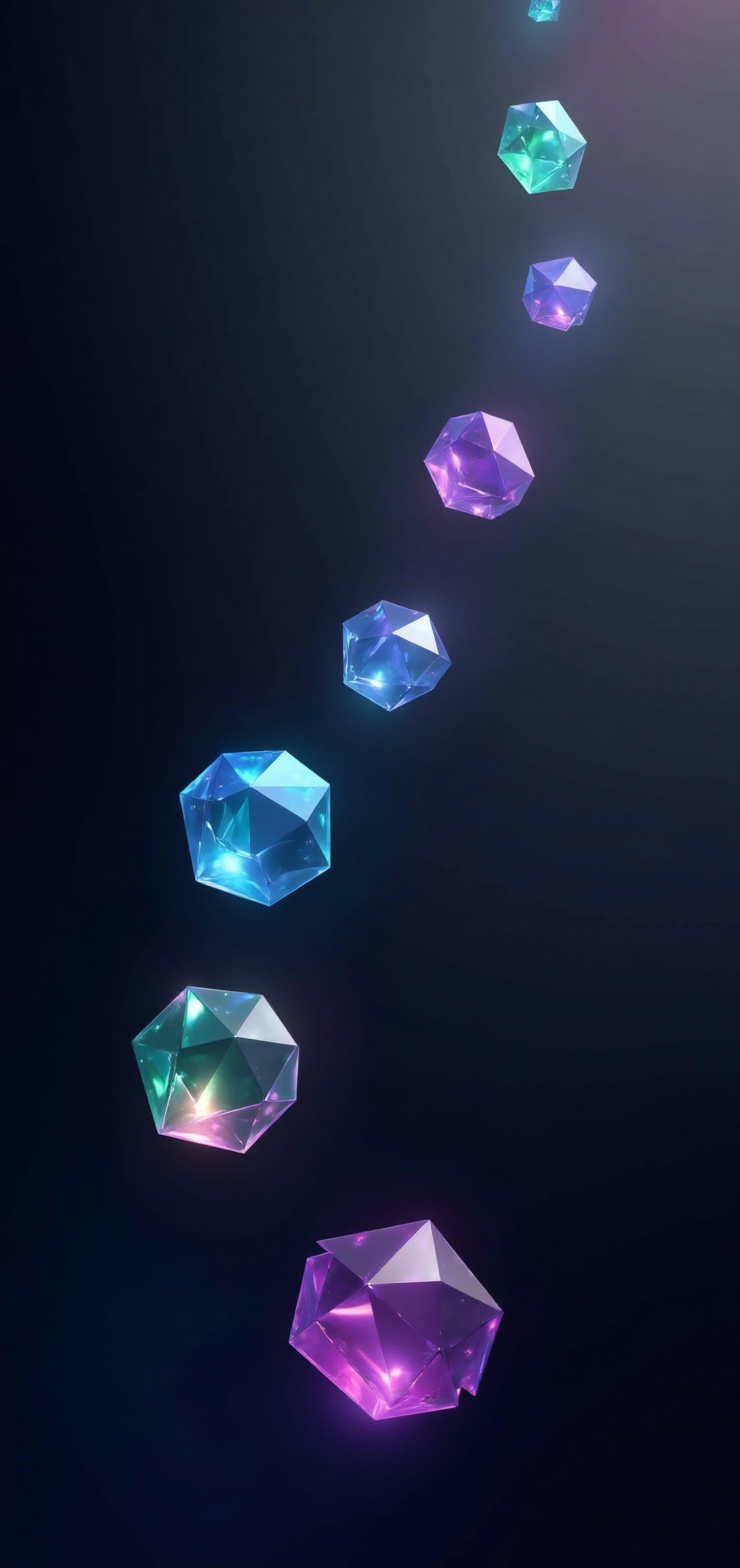 Illuminate your screen with this mesmerizing abstract wallpaper showcasing a trail of vibrant, faceted crystal gems floating in a dark cosmic void, transitioning through a spectrum of teal, blue, purple, and pink hues with radiant glow effects. Perfect for smartphones, this high-resolution design captures a futuristic, jewel-like aesthetic inspired by digital art and fantasy elements. Ideal for free HD downloads of crystal backgrounds, rainbow gradients, abstract gems, or glowing patterns to add a magical sparkle to your device's home or lock screen.