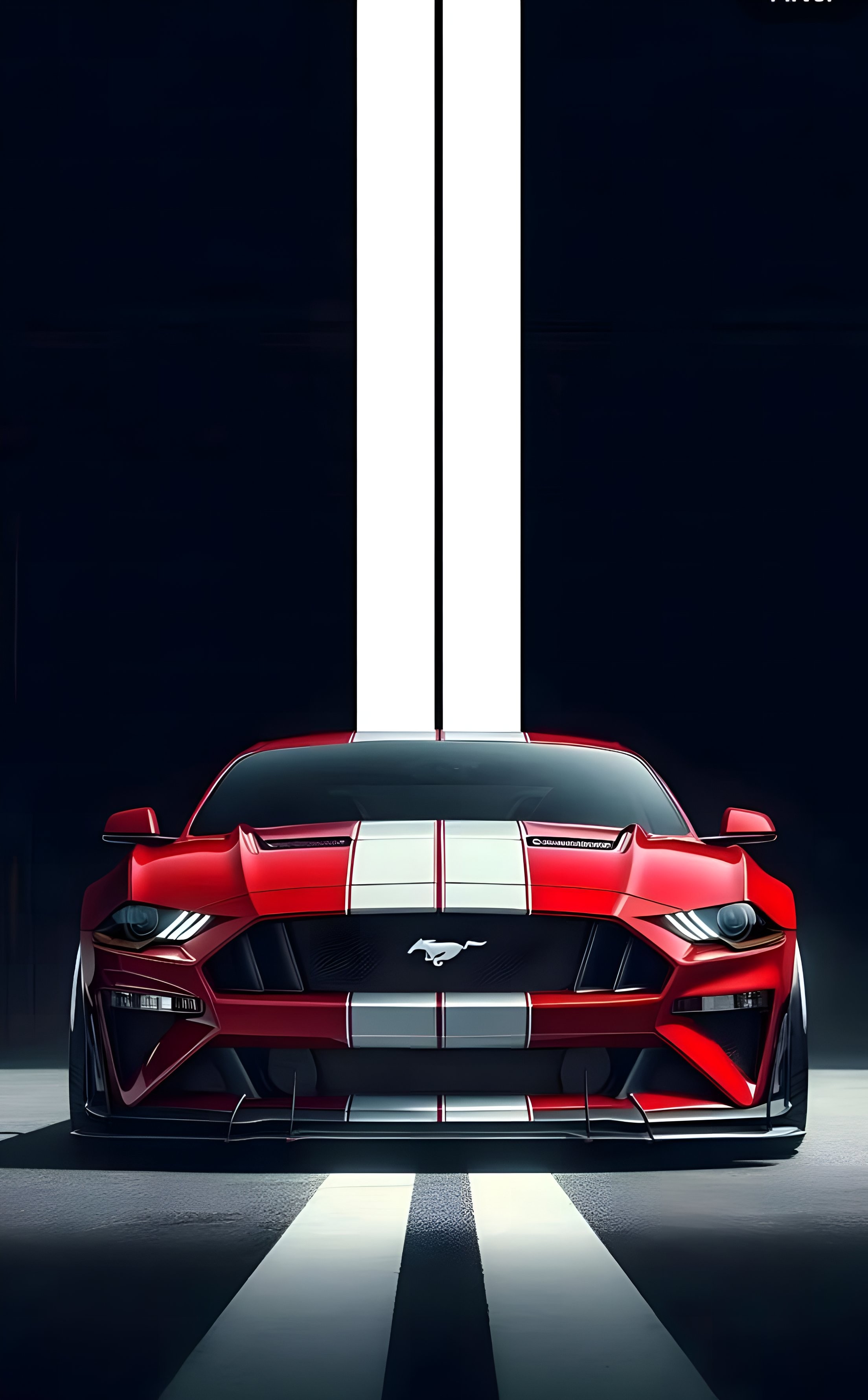 This striking image features a powerful red Ford Mustang GT muscle car, adorned with bold white racing stripes that extend from its hood upwards, continuing as two prominent vertical lines against a stark dark grey or black background. The car is showcased in a head-on, low-angle shot, highlighting its aggressive front fascia, iconic pony emblem, and sharp headlights. The ground beneath the car also features white stripes, perfectly aligning with those on the car and background, creating a strong, symmetrical, and dynamic composition. Subtle lighting emphasizes its curves and aggressive stance. This visual is perfect for automotive enthusiasts, Mustang fans, American muscle car content, and themes of power, speed, and iconic design. It's ideal for car show promotions, lifestyle blogs, social media graphics, or any content celebrating high-performance vehicles.