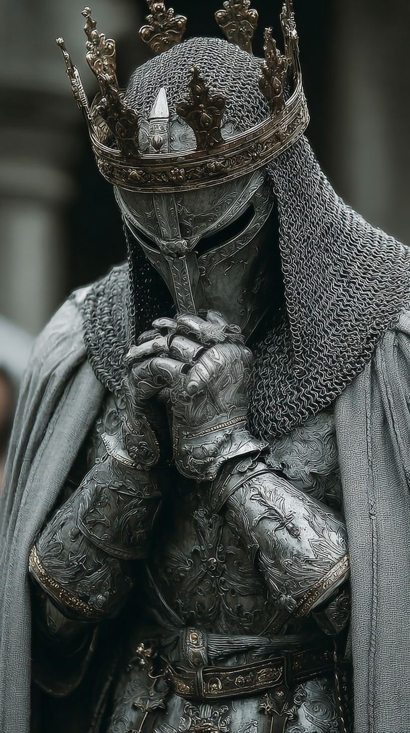 A highly detailed, vertical close-up of a medieval knight or king figure, heavily clad in intricate, dark ornate plate armor and chainmail. The figure is wearing a prominent crown over the helmet and holds armored hands together in a posture of prayer or solemn reflection. The gray cloak and muted background enhance the serious, dignified, and epic fantasy atmosphere. Ideal for content on medieval royalty, historical fantasy, RPG character art, knights of the realm, or intricate armor design. Keywords: Knight king, ornate armor, crown, medieval prayer, solemn warrior, chainmail, historical fantasy, detailed plate armor, epic portrait.