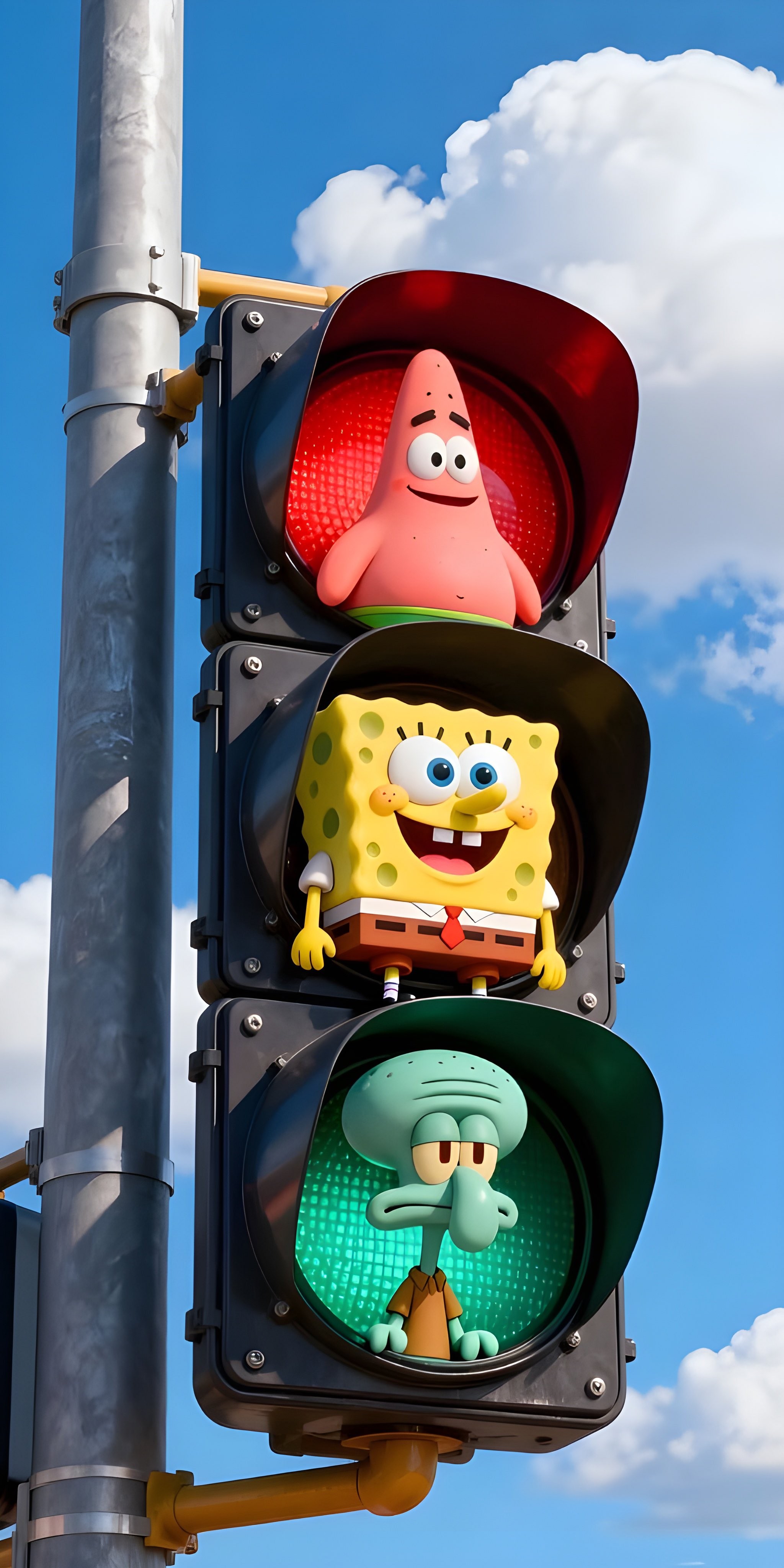 Epic and funny SpongeBob SquarePants traffic light featuring Patrick Star on red, SpongeBob on yellow, and grumpy Squidward on green! Perfect viral meme wallpaper, 4K digital art for fans of Bikini Bottom humor. Download this hilarious SpongeBob meme and bring the laughs to your screen!