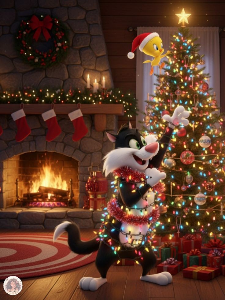 Celebrate the holidays with pure cartoon joy in this adorable 4K wallpaper Sylvester the cat tangled in twinkling Christmas lights, holding a tiny Tweety in a Santa hat next to a beautifully decorated tree, fireplace & gifts! Perfect for Looney Tunes fans to bring festive fun to your phone or desktop. High resolution, free to download and enjoy.