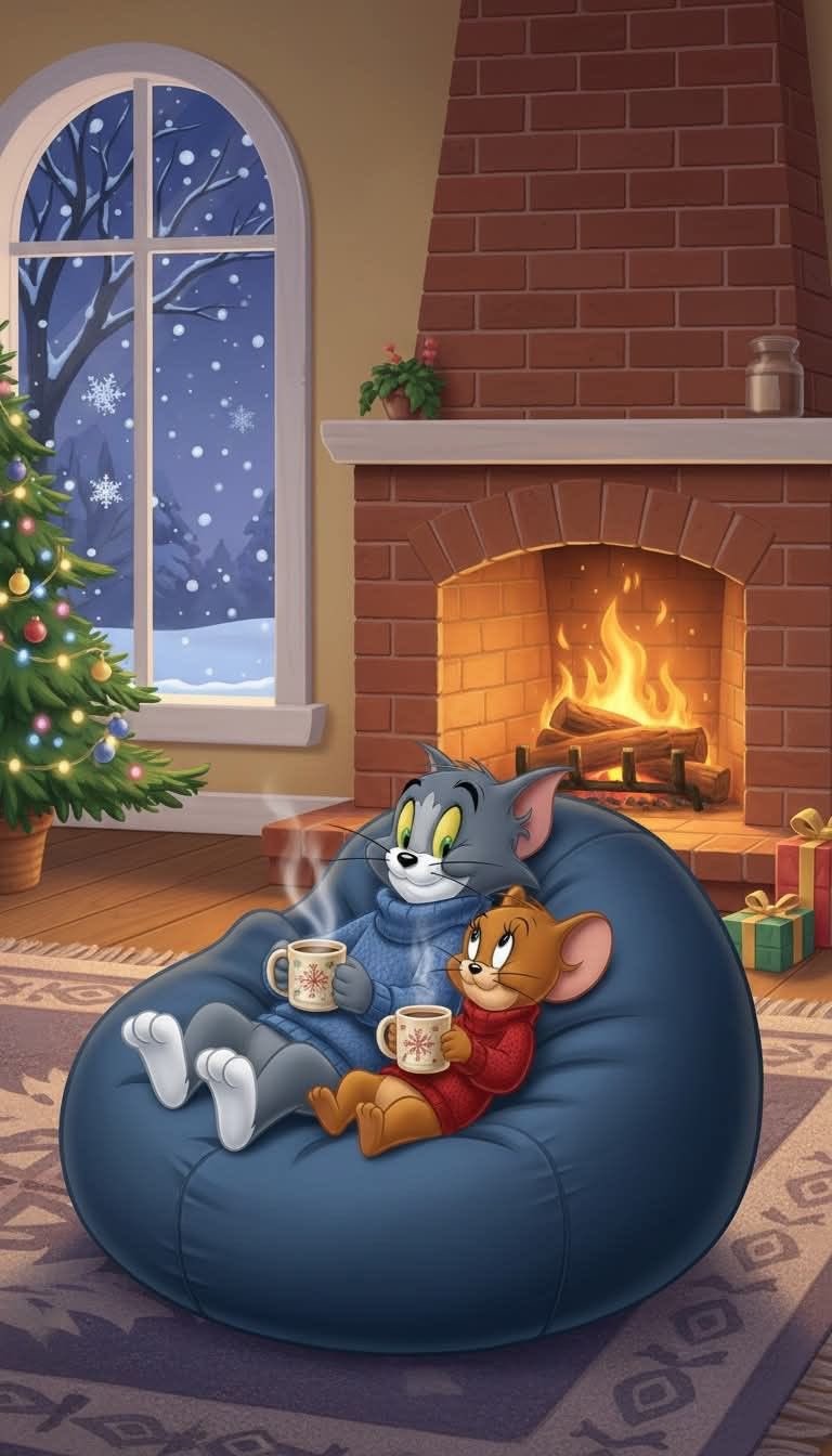 Warm up your holidays with this heartwarming 4K wallpaper Tom & Jerry cuddling in a giant blue beanbag, sipping hot cocoa by the roaring fireplace, Christmas tree twinkling, snow falling outside the window, gifts & cozy vibes everywhere! Perfect Tom and Jerry fans festive scene for phone or desktop pure winter magic & friendship feels. High resolution, free to download and enjoy.
