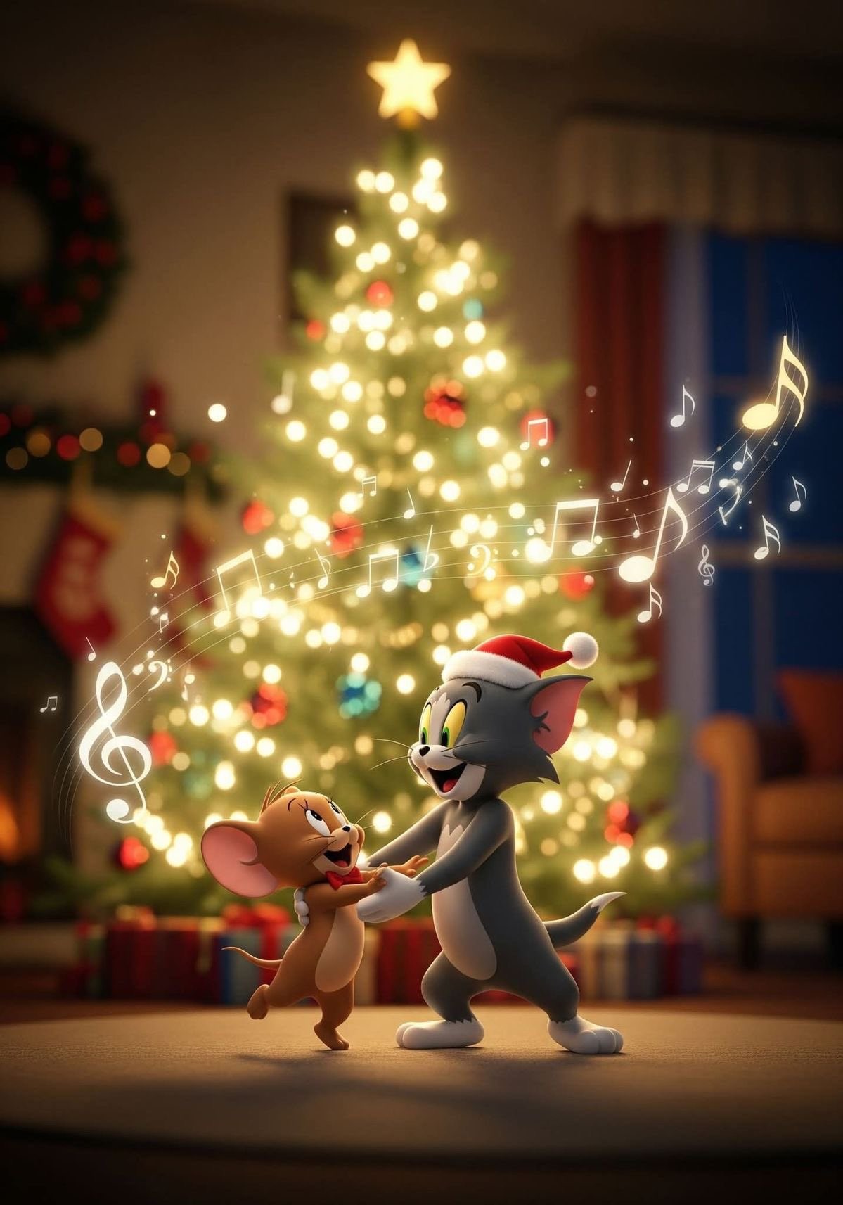 Fill your screen with holiday joy from Tom & Jerry! This heartwarming 4K wallpaper shows Tom in a Santa hat happily dancing with little Jerry under a glowing Christmas tree, sparkling lights, musical notes & cozy room vibes. Perfect festive cartoon magic for your phone or desktop spread smiles this Christmas! High resolution, free to download and enjoy.