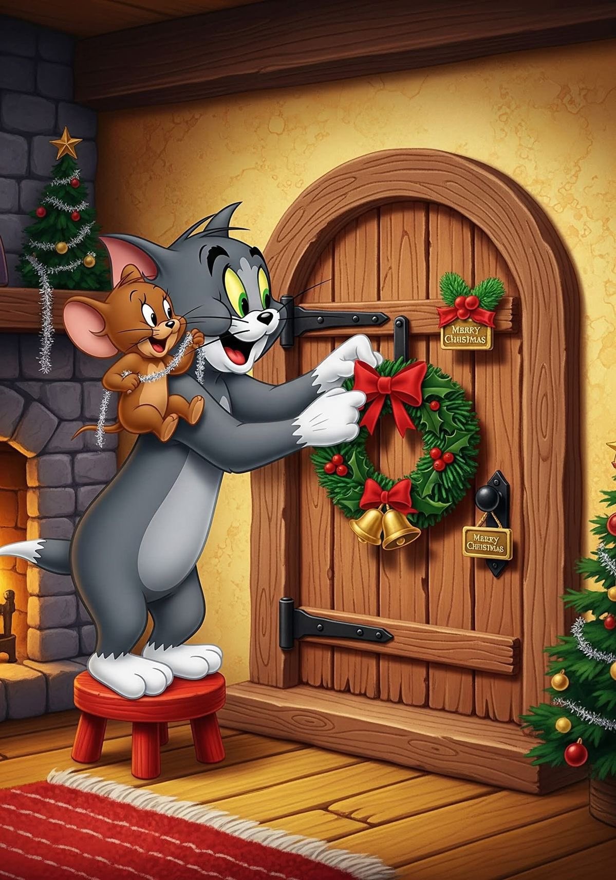 Spread holiday cheer with this heartwarming 4K wallpaper of Tom holding Jerry up to hang a festive Christmas wreath on the door! Cozy cabin interior, twinkling lights, tree & classic cartoon magic perfect for Tom & Jerry fans to brighten your phone or desktop this Christmas. High resolution, free to download and enjoy.