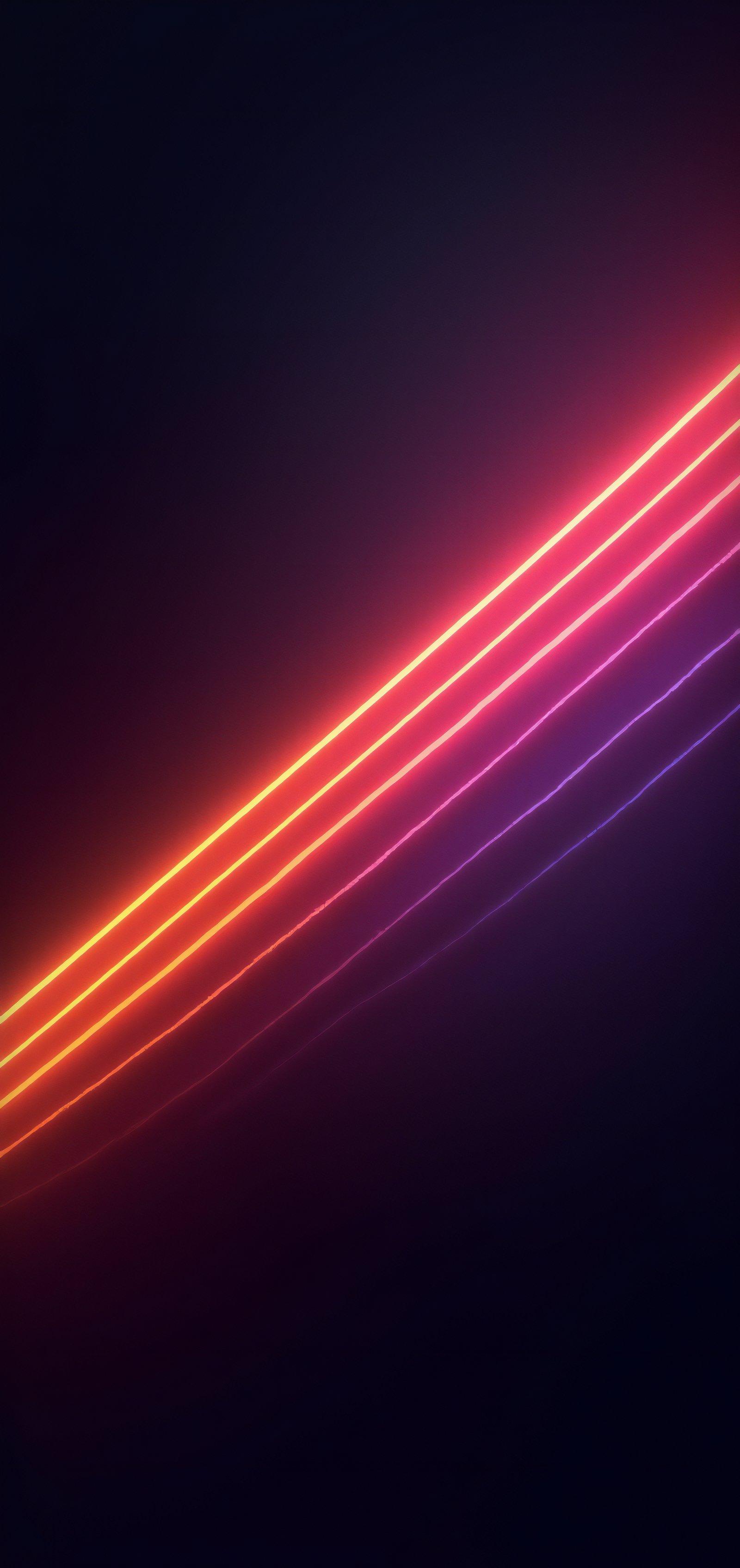Discover this captivating abstract neon wallpaper featuring three diagonal glowing lines in a gradient of fiery orange, vibrant pink, and deep purple against a mysterious dark blue-black background. Ideal for smartphone screens, this high-resolution image evokes a retro 80s synthwave aesthetic, perfect for adding a futuristic glow to your device. Free download available for HD neon backgrounds, abstract art, and glow effects enthusiasts.