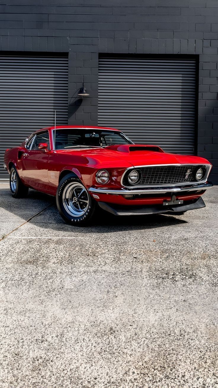 A striking photograph of a meticulously restored 1969 Ford Mustang Mach 1 in a brilliant red finish. This iconic American muscle car, featuring the aggressive hood scoop and classic styling, is parked against a dark, industrial roller door backdrop, emphasizing its vibrant color and powerful silhouette. Perfect for content about classic cars, vintage Mustangs, muscle car restoration, or performance vehicles. Keywords: 1969 Mustang, Mach 1, classic car, American muscle, vintage Ford, red car, car photography, V8 engine.