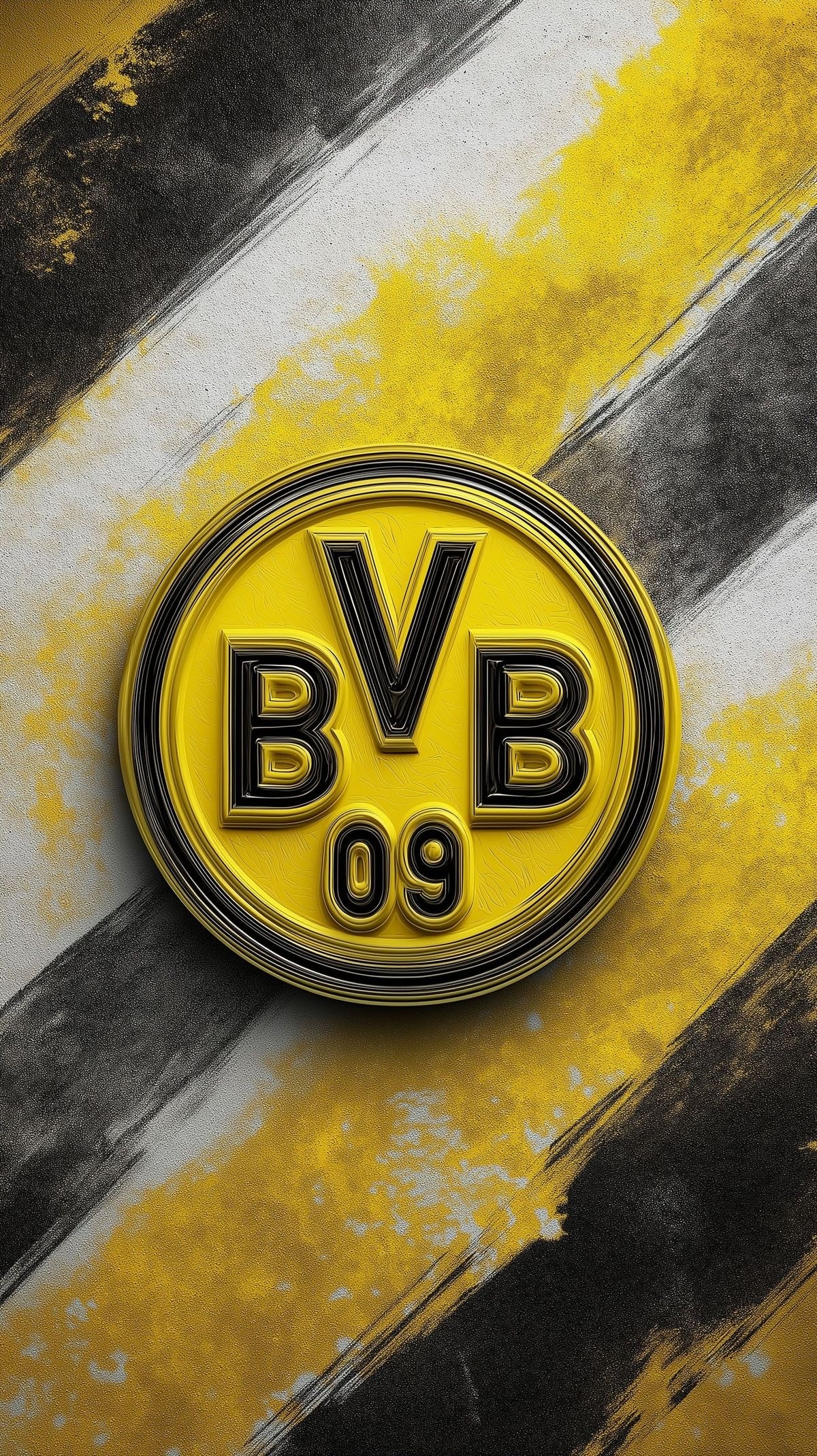 This bold and energetic image features the iconic Borussia Dortmund (BVB 09) crest, rendered in a clear, striking yellow and black 3D style that stands out prominently. The circular emblem, featuring the letters "BVB" and "09," is centered against a heavily textured background. The background is composed of bold, diagonal paint strokes in yellow, black, and rough white/grey, creating a vibrant, street art-inspired aesthetic that perfectly represents the club's famous colors and passionate culture. This visual is perfect for Borussia Dortmund fans, soccer (football) enthusiasts, sports merchandise, fan art, and themes of German football, Bundesliga, team pride, and dynamic sports art. Ideal for wallpapers, social media content, or fan communities celebrating the famous German club.
