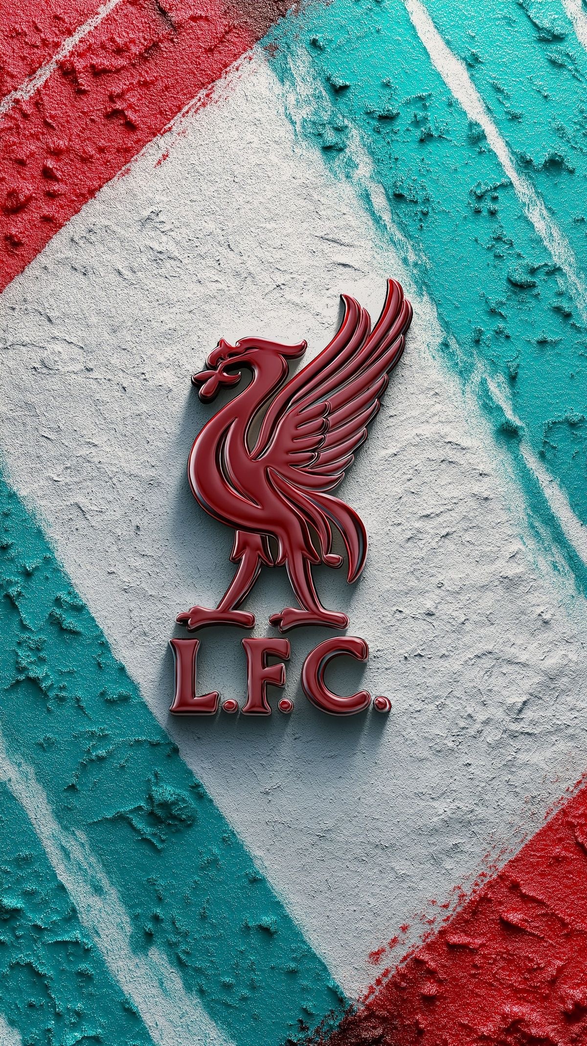 This vibrant and impactful image features the iconic Liverpool FC Liver Bird crest, rendered in a glossy deep red 3D style that stands out prominently. The "L.F.C." initials are also bold beneath it. The emblem is set against a heavily textured background that appears to be rough concrete or plaster, painted with bold, contrasting stripes of red, white, and teal/light blue. This creates a raw, industrial, or street art aesthetic that gives the image a powerful, modern edge. The contrasting colors and textures make the Liver Bird truly pop. This image is perfect for Liverpool FC fans, soccer (football) enthusiasts, sports merchandise, fan art, and themes of loyalty, team spirit, and iconic sports brands. Ideal for social media, sports blogs, fan communities, or any content celebrating one of the world's most historic football clubs.